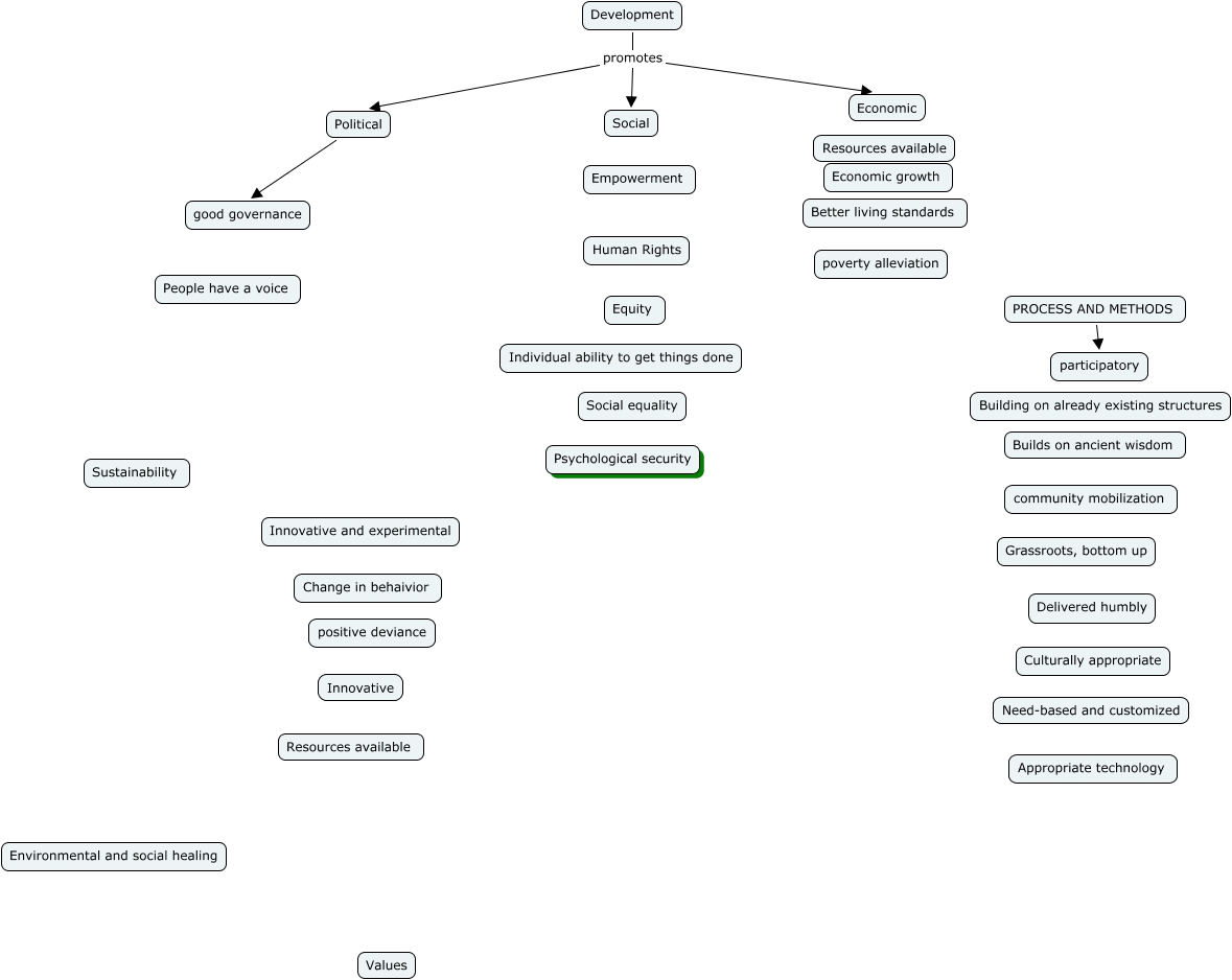 This Concept Map, created with IHMC CmapTools, has information related to: bambiphilosophy, Development promotes Economic, PROCESS AND METHODS participatory, Political good governance, Development promotes Political, Development promotes Social