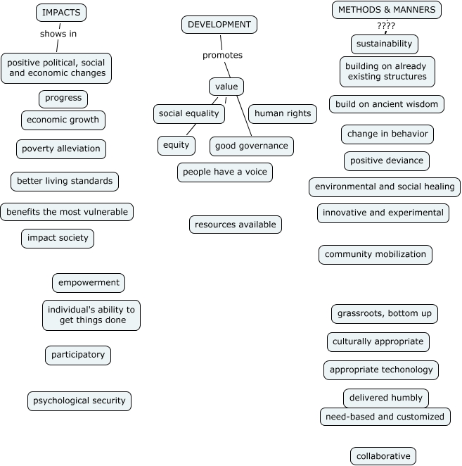 This Concept Map, created with IHMC CmapTools, has information related to: bambi--what development means, sustainability ???? METHODS & MANNERS, value social equality, IMPACTS shows in positive political, social and economic changes, value equity, DEVELOPMENT promotes good governance, sustainability ???? METHODS & MANNERS