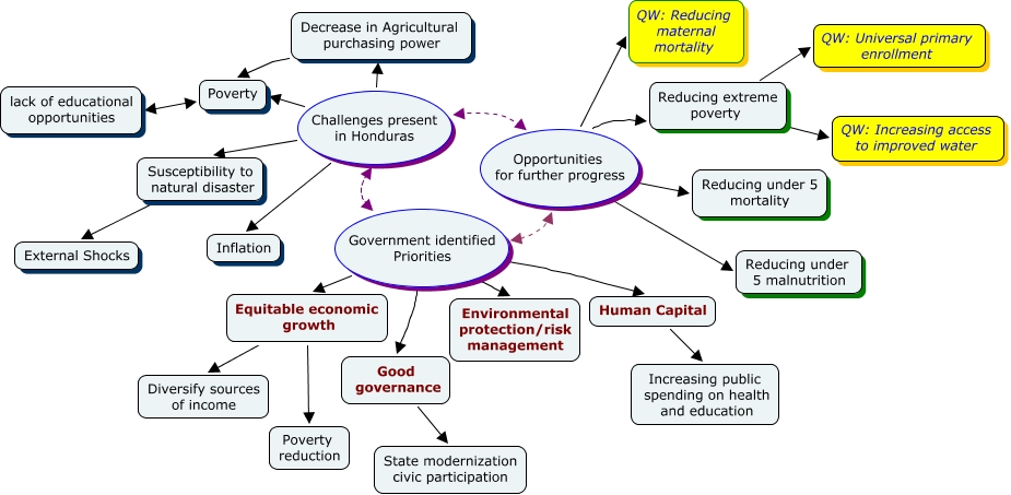 This Concept Map, created with IHMC CmapTools, has information related to: Honduras Group 2, Challenges present in Honduras Poverty, Challenges present in Honduras Susceptibility to natural disaster, Government identified Priorities Human Capital, Challenges present in Honduras Opportunities for further progress, Good governance State modernization civic participation, Reducing extreme poverty QW: Increasing access to improved water, Government identified Priorities Good governance, Challenges present in Honduras Inflation, Susceptibility to natural disaster External Shocks, Poverty lack of educational opportunities, Opportunities for further progress Reducing under 5 mortality, Equitable economic growth Poverty reduction, Opportunities for further progress Reducing under 5 malnutrition, Opportunities for further progress Government identified Priorities, Equitable economic growth Diversify sources of income, Government identified Priorities Environmental protection/risk management, Reducing extreme poverty QW: Universal primary enrollment, Decrease in Agricultural purchasing power Poverty, Opportunities for further progress Reducing extreme poverty, Opportunities for further progress QW: Reducing maternal mortality