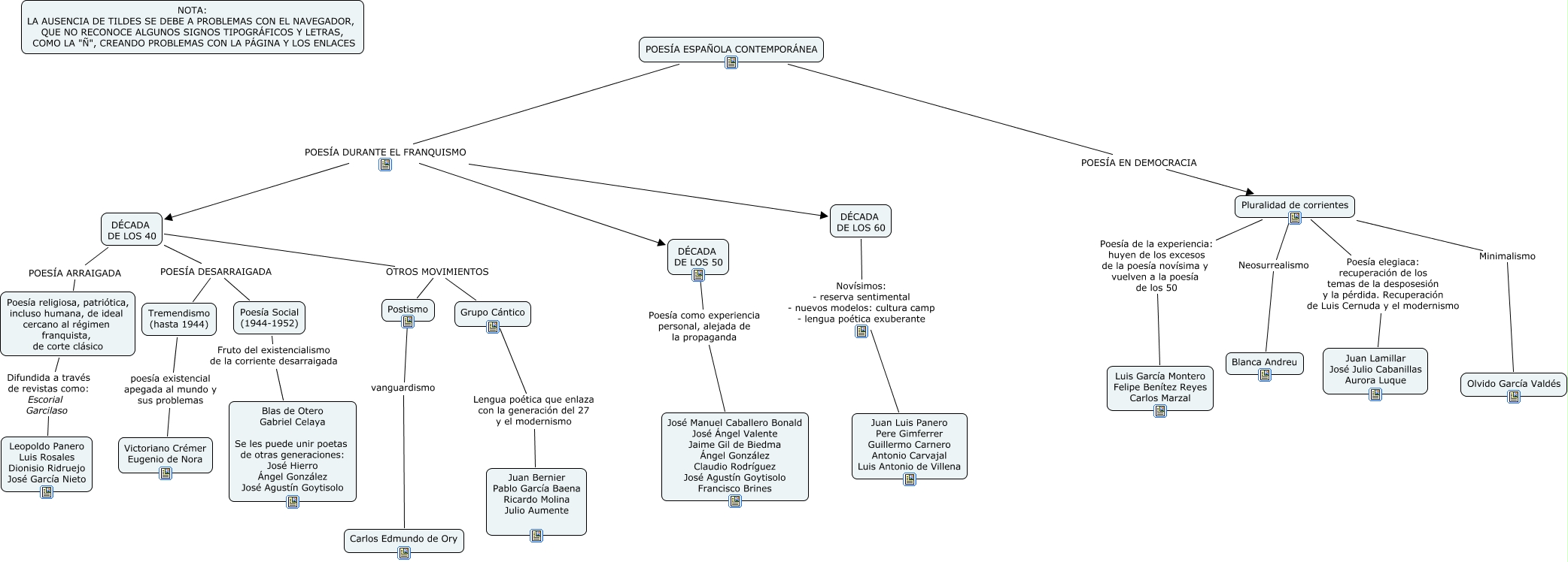 Este mapa conceptual tiene información relacionada a: POESÍA ESPAÑOLA CONTEMPORÁNEA, Pluralidad de corrientes Poesía de la experiencia: huyen de los excesos de la poesía novísima y vuelven a la poesía de los 50 Luis García Montero Felipe Benítez Reyes Carlos Marzal, Poesía Social (1944-1952) Fruto del existencialismo de la corriente desarraigada Blas de Otero Gabriel Celaya Se les puede unir poetas de otras generaciones: José Hierro Ángel González José Agustín Goytisolo, POESÍA ESPAÑOLA CONTEMPORÁNEA POESÍA DURANTE EL FRANQUISMO DÉCADA DE LOS 50, Postismo vanguardismo Carlos Edmundo de Ory, Tremendismo (hasta 1944) poesía existencial apegada al mundo y sus problemas Victoriano Crémer Eugenio de Nora, Grupo Cántico Lengua poética que enlaza con la generación del 27 y el modernismo Juan Bernier Pablo García Baena Ricardo Molina Julio Aumente, Pluralidad de corrientes Minimalismo Olvido García Valdés, DÉCADA DE LOS 40 POESÍA DESARRAIGADA Tremendismo (hasta 1944), Poesía religiosa, patriótica, incluso humana, de ideal cercano al régimen franquista, de corte clásico Difundida a través de revistas como: Escorial Garcilaso Leopoldo Panero Luis Rosales Dionisio Ridruejo José García Nieto, DÉCADA DE LOS 40 POESÍA DESARRAIGADA Poesía Social (1944-1952), POESÍA ESPAÑOLA CONTEMPORÁNEA POESÍA DURANTE EL FRANQUISMO DÉCADA DE LOS 40, DÉCADA DE LOS 40 OTROS MOVIMIENTOS Postismo, DÉCADA DE LOS 50 Poesía como experiencia personal, alejada de la propaganda José Manuel Caballero Bonald José Ángel Valente Jaime Gil de Biedma Ángel González Claudio Rodríguez José Agustín Goytisolo Francisco Brines, DÉCADA DE LOS 40 OTROS MOVIMIENTOS Grupo Cántico, POESÍA ESPAÑOLA CONTEMPORÁNEA POESÍA EN DEMOCRACIA Pluralidad de corrientes, DÉCADA DE LOS 60 Novísimos: - reserva sentimental - nuevos modelos: cultura camp - lengua poética exuberante Juan Luis Panero Pere Gimferrer Guillermo Carnero Antonio Carvajal Luis Antonio de Villena, Pluralidad de corrientes Poesía elegiaca: recuperación de los temas de la desposesión y la pérdida. Recuperación de Luis Cernuda y el modernismo Juan Lamillar José Julio Cabanillas Aurora Luque, DÉCADA DE LOS 40 POESÍA ARRAIGADA Poesía religiosa, patriótica, incluso humana, de ideal cercano al régimen franquista, de corte clásico, Pluralidad de corrientes Neosurrealismo Blanca Andreu, POESÍA ESPAÑOLA CONTEMPORÁNEA POESÍA DURANTE EL FRANQUISMO DÉCADA DE LOS 60