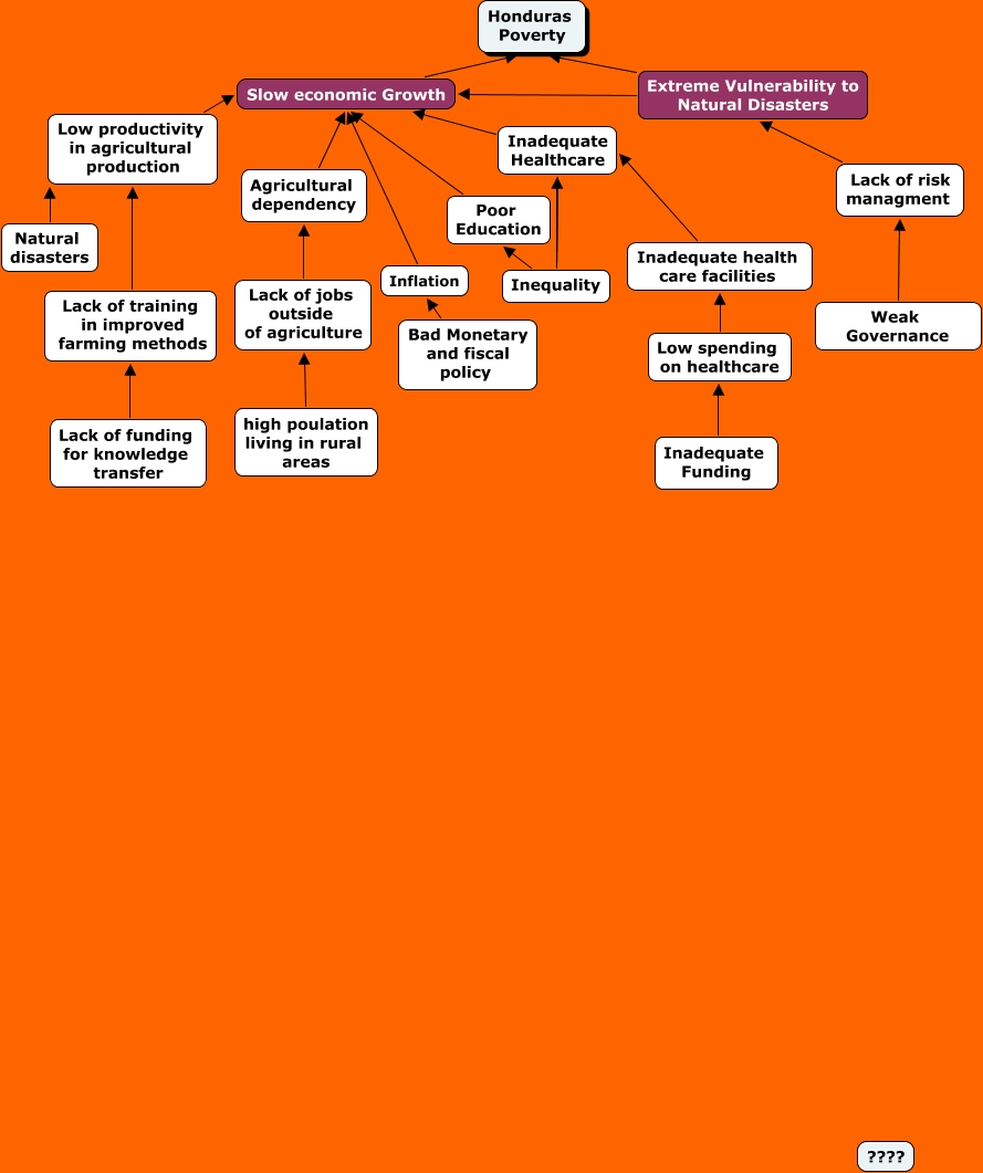 This Concept Map, created with IHMC CmapTools, has information related to: The best problem tree ever today - Honduras, Weak Governance Lack of risk managment, Inflation Slow economic Growth, Lack of risk managment Extreme Vulnerability to Natural Disasters, Lack of funding for knowledge transfer Lack of training in improved farming methods, Natural disasters Low productivity in agricultural production, Low spending on healthcare Inadequate health care facilities, Slow economic Growth Honduras Poverty, Inadequate Healthcare Inequality, Low productivity in agricultural production Slow economic Growth, Inequality Poor Education, Inadequate Funding Low spending on healthcare, Extreme Vulnerability to Natural Disasters Slow economic Growth, Lack of jobs outside of agriculture Agricultural dependency, Extreme Vulnerability to Natural Disasters Honduras Poverty, high poulation living in rural areas Lack of jobs outside of agriculture, Inequality Inadequate Healthcare, Inadequate Healthcare Slow economic Growth, Lack of training in improved farming methods Low productivity in agricultural production, Inadequate Healthcare Inequality, Agricultural dependency Slow economic Growth