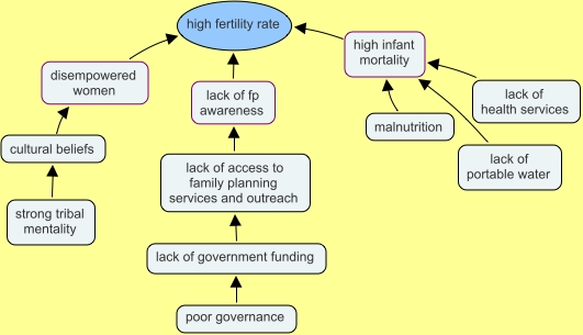 This Concept Map, created with IHMC CmapTools, has information related to: Yemen Problem Tree, lack of government funding lack of access to family planning services and outreach, poor governance lack of government funding, disempowered women high fertility rate, strong tribal mentality cultural beliefs, lack of health services high infant mortality, cultural beliefs disempowered women, lack of portable water high infant mortality, lack of access to family planning services and outreach lack of fp awareness, high infant mortality high fertility rate, lack of fp awareness high fertility rate, malnutrition high infant mortality