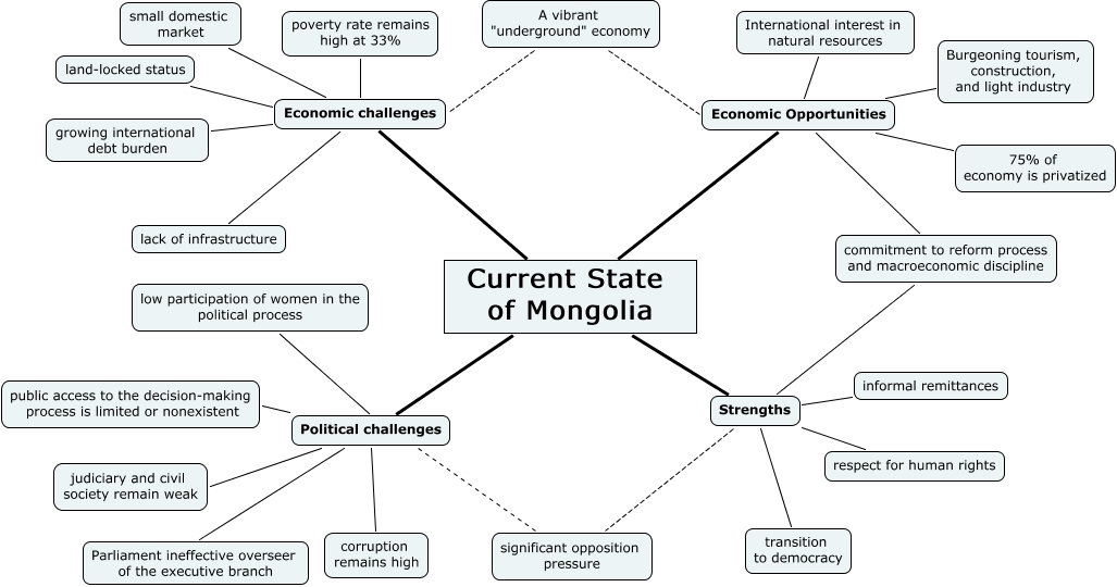 This Concept Map, created with IHMC CmapTools, has information related to: mongolia, significant opposition pressure Political challenges, land-locked status Economic challenges, Strengths transition to democracy, Economic Opportunities commitment to reform process and macroeconomic discipline, corruption remains high Political challenges, small domestic market Economic challenges, Current State of Mongolia Economic Opportunities, A vibrant "underground" economy Economic challenges, Current State of Mongolia Economic challenges, low participation of women in the political process Political challenges, Strengths respect for human rights, Political challenges Parliament ineffective overseer of the executive branch, Current State of Mongolia Political challenges, Political challenges public access to the decision-making process is limited or nonexistent, Strengths informal remittances, Economic Opportunities Burgeoning tourism, construction, and light industry, growing international debt burden Economic challenges, Strengths significant opposition pressure, lack of infrastructure Economic challenges, Political challenges judiciary and civil society remain weak