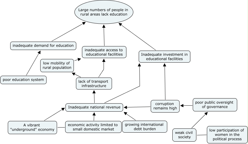 This Concept Map, created with IHMC CmapTools, has information related to: Mongolia Problem Tree, Inadequate investment in educational facilities Large numbers of people in rural areas lack education, growing international debt burden Inadequate national revenue, corruption remains high Inadequate national revenue, Inadequate national revenue lack of transport infrastructure, economic activity limited to small domestic market Inadequate national revenue, poor education system inadequate demand for education, corruption remains high Inadequate investment in educational facilities, low participation of women in the political process weak civil society, economic activity limited to small domestic market A vibrant "underground" economy, inadequate access to educational facilities Large numbers of people in rural areas lack education, lack of transport infrastructure low mobility of rural population, inadequate demand for education Large numbers of people in rural areas lack education, Inadequate national revenue Inadequate investment in educational facilities, weak civil society poor public oversight of governance, low mobility of rural population inadequate access to educational facilities, A vibrant "underground" economy Inadequate national revenue, lack of transport infrastructure inadequate access to educational facilities, poor public oversight of governance corruption remains high