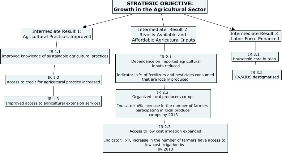This Concept Map, created with IHMC CmapTools, has information related to: RF Zambia, IR 1.1 Improved knowledge of sustainable agricultural practices IR 1.2 Access to credit for agricultural practice increased, STRATEGIC OBJECTIVE: Growth in the Agricultural Sector Intermediate Result 2: Readily Available and Affordable Agricutural Inputs, IR 3.1 Household care burden IR 3.2 HIV/AIDS destigmatised, IR 2.2 Organized local producers co-ops Indicator: x% increase in the number of farmers participating in local producer co-ops by 2013 IR 2.3 Access to low cost irrigation expanded Indicator: x% increase in the number of farmers have access to low cost irrigation by by 2013, IR 2.1 Dependance on imported agricultural inputs reduced Indicator: x% of fertilizers and pesticides consumed that are locally produced IR 2.2 Organized local producers co-ops Indicator: x% increase in the number of farmers participating in local producer co-ops by 2013, Intermediate Result 2: Readily Available and Affordable Agricutural Inputs IR 2.1 Dependance on imported agricultural inputs reduced Indicator: x% of fertilizers and pesticides consumed that are locally produced, STRATEGIC OBJECTIVE: Growth in the Agricultural Sector Intermediate Result 3: Labor Force Enhanced, IR 1.2 Access to credit for agricultural practice increased IR 1.3 Improved access to agricultural extension services, Intermediate Result 1: Agricultural Practices Improved IR 1.1 Improved knowledge of sustainable agricultural practices, Intermediate Result 3: Labor Force Enhanced IR 3.1 Household care burden, STRATEGIC OBJECTIVE: Growth in the Agricultural Sector Intermediate Result 1: Agricultural Practices Improved