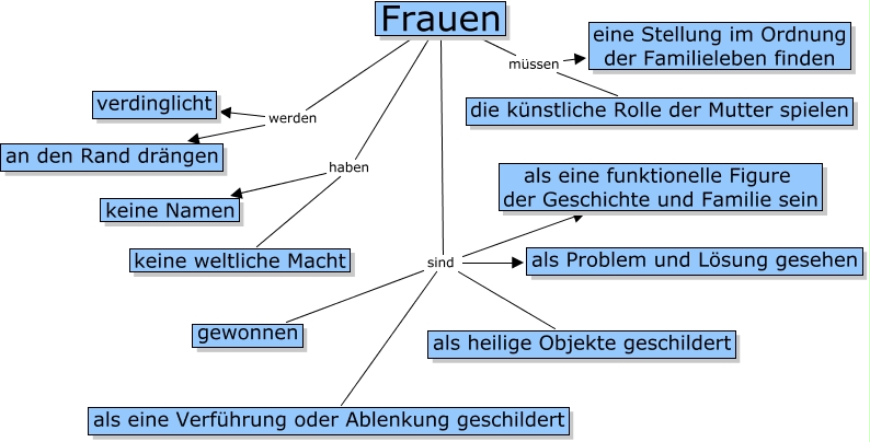 This Concept Map, created with IHMC CmapTools, has information related to: Frauenverehrung, Frauen haben keine Namen, Frauen sind als eine Verführung oder Ablenkung geschildert, Frauen müssen eine Stellung im Ordnung der Familieleben finden, Frauen sind als eine funktionelle Figure der Geschichte und Familie sein, Frauen werden verdinglicht, Frauen sind als heilige Objekte geschildert, Frauen sind gewonnen, Frauen haben keine weltliche Macht, Frauen müssen die künstliche Rolle der Mutter spielen, Frauen sind als Problem und Lösung gesehen, Frauen werden an den Rand drängen