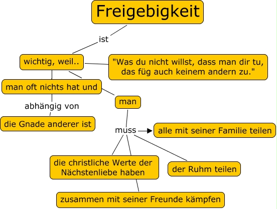This Concept Map, created with IHMC CmapTools, has information related to: Freigebigkeit, man muss die christliche Werte der Nächstenliebe haben, man muss der Ruhm teilen, wichtig, weil.. man oft nichts hat und, man muss zusammen mit seiner Freunde kämpfen, wichtig, weil.. ???? man, Freigebigkeit ist wichtig, weil.., wichtig, weil.. abhängig von die Gnade anderer ist, wichtig, weil.. ???? "Was du nicht willst, dass man dir tu, das füg auch keinem andern zu.", man muss alle mit seiner Familie teilen