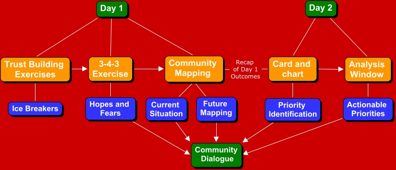 This Concept Map, created with IHMC CmapTools, has information related to: Dharavi group 4 facilitation techniques, Current Situation Community Dialogue, Card and chart Analysis Window, Future Mapping Community Dialogue, Community Mapping Recap of Day 1 Outcomes Card and chart, Current Situation Community Mapping, Actionable Priorities Analysis Window, 3-4-3 Exercise Community Mapping, Day 1 3-4-3 Exercise, Actionable Priorities Community Dialogue, Priority Identification Card and chart, Ice Breakers Trust Building Exercises, Day 2 Analysis Window, Hopes and Fears 3-4-3 Exercise, Trust Building Exercises 3-4-3 Exercise, Hopes and Fears Community Dialogue, Priority Identification Community Dialogue, Day 2 Card and chart, Day 1 Community Mapping, Day 1 Trust Building Exercises, Future Mapping Community Mapping