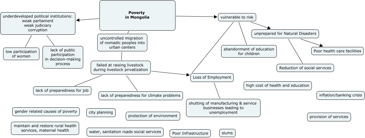 This Concept Map has information related to: Test 2Mongolia Cmap, vulnerable to risk unprepared for Natural Disasters, vulnerable to risk abandonment of education for children, vulnerable to risk Loss of Employment, underdeveloped political institutions: weak parliament weak judiciary corruption lack of public participation in decision-making process, Poverty in Mongolia uncontrolled migration of nomadic peoples into urban centers, failed at raising livestock during livestock privatization lack of preparedness for climate problems, Loss of Employment shutting of manufacturing & service businesses leading to unemployment, failed at raising livestock during livestock privatization Loss of Employment, unprepared for Natural Disasters Reduction of social services, failed at raising livestock during livestock privatization lack of preparedness for job