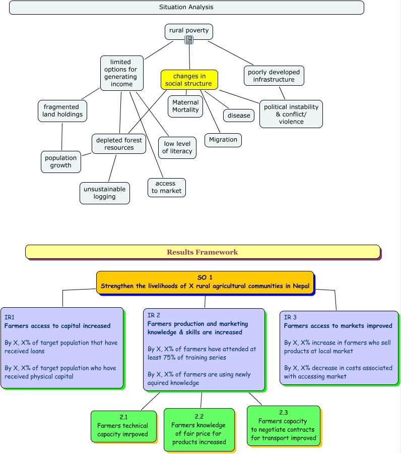 This Concept Map, created with IHMC CmapTools, has information related to: Nepal 2_situation analysis, IR 2 Farmers production and marketing knowledge & skills are increased By X, X% of farmers have attended at least 75% of training series By X, X% of farmers are using newly aquired knowledge 2.3 Farmers capacity to negotiate contracts for transport improved, SO 1 Strengthen the livelihoods of X rural agricultural communities in Nepal IR 3 Farmers access to markets improved By X, X% increase in farmers who sell products at local market By X, X% decrease in costs associated with accessing market, rural poverty poorly developed infrastructure, depleted forest resources population growth, poorly developed infrastructure political instability & conflict/ violence, rural poverty changes in social structure, depleted forest resources unsustainable logging, IR 2 Farmers production and marketing knowledge & skills are increased By X, X% of farmers have attended at least 75% of training series By X, X% of farmers are using newly aquired knowledge 2.2 Farmers knowledge of fair price for products increased, IR 2 Farmers production and marketing knowledge & skills are increased By X, X% of farmers have attended at least 75% of training series By X, X% of farmers are using newly aquired knowledge 2.1 Farmers technical capacity imrpoved, rural poverty limited options for generating income, changes in social structure ???? Migration, limited options for generating income low level of literacy, changes in social structure political instability & conflict/ violence, limited options for generating income depleted forest resources, SO 1 Strengthen the livelihoods of X rural agricultural communities in Nepal IR1 Farmers access to capital increased By X, X% of target population that have received loans By X, X% of target population who have received physical capital, changes in social structure ???? Maternal Mortality, SO 1 Strengthen the livelihoods of X rural agricultural communities in Nepal IR 2 Farmers production and marketing knowledge & skills are increased By X, X% of farmers have attended at least 75% of training series By X, X% of farmers are using newly aquired knowledge, changes in social structure disease, fragmented land holdings population growth, limited options for generating income fragmented land holdings