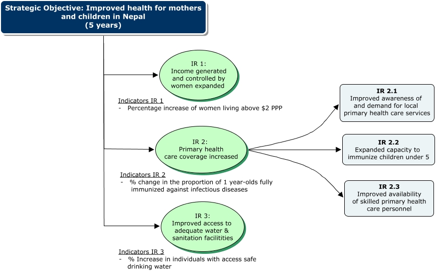 This Concept Map, created with IHMC CmapTools, has information related to: Nepal 1 Results Framework, Strategic Objective: Improved health for mothers and children in Nepal (5 years) IR 2: Primary health care coverage increased, Strategic Objective: Improved health for mothers and children in Nepal (5 years) IR 1: Income generated and controlled by women expanded, IR 2: Primary health care coverage increased IR 2.3 Improved availability of skilled primary health care personnel, IR 2: Primary health care coverage increased IR 2.2 Expanded capacity to immunize children under 5, IR 2: Primary health care coverage increased IR 2.1 Improved awareness of and demand for local primary health care services, Strategic Objective: Improved health for mothers and children in Nepal (5 years) IR 3: Improved access to adequate water & sanitation facilitities