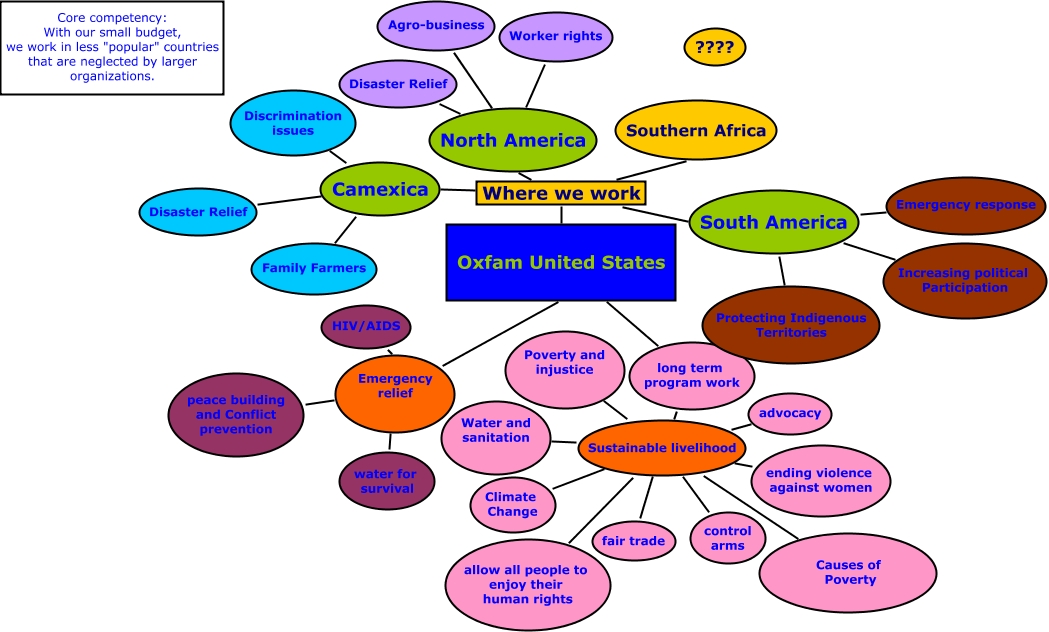 This Concept Map, created with IHMC CmapTools, has information related to: Oxfam Day 01, Sustainable livelihood advocacy, Worker rights North America, Sustainable livelihood Poverty and injustice, HIV/AIDS Emergency relief, Where we work Camexica, Climate Change Sustainable livelihood, South America Protecting Indigenous Territories, Disaster Relief North America, control arms Sustainable livelihood, water for survival Emergency relief, Where we work Southern Africa, ending violence against women Sustainable livelihood, peace building and Conflict prevention Emergency relief, Disaster Relief Camexica, Agro-business North America, Oxfam United States long term program work, Where we work South America, Sustainable livelihood Water and sanitation, South America Increasing political Participation, Camexica Discrimination issues