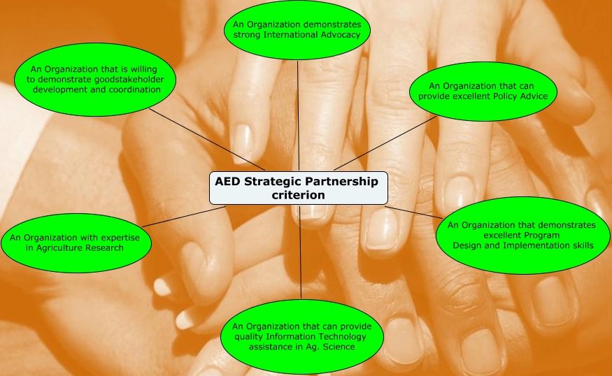 This Concept Map, created with IHMC CmapTools, has information related to: AED strategic partners, AED Strategic Partnership criterion An Organization that can provide quality Information Technology assistance in Ag. Science, AED Strategic Partnership criterion An Organization demonstrates strong International Advocacy, AED Strategic Partnership criterion An Organization with expertise in Agriculture Research, AED Strategic Partnership criterion An Organization that is willing to demonstrate goodstakeholder development and coordination, AED Strategic Partnership criterion An Organization that can provide excellent Policy Advice, AED Strategic Partnership criterion An Organization that demonstrates excellent Program Design and Implementation skills