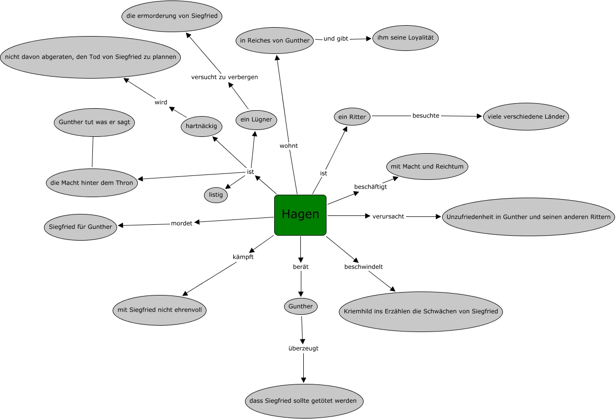 This Concept Map, created with IHMC CmapTools, has information related to: Hagen, ein Lügner versucht zu verbergen die ermorderung von Siegfried, ein Ritter besuchte viele verschiedene Länder, Hagen berät Gunther, Hagen beschwindelt Kriemhild ins Erzählen die Schwächen von Siegfried, Gunther überzeugt dass Siegfried sollte getötet werden, Hagen ist die Macht hinter dem Thron, Hagen verursacht Unzufriedenheit in Gunther und seinen anderen Rittern, Hagen ist ein Lügner, in Reiches von Gunther und gibt ihm seine Loyalität, Hagen kämpft mit Siegfried nicht ehrenvoll, Hagen ist ein Ritter, Hagen ist hartnäckig, Hagen beschäftigt mit Macht und Reichtum, Hagen mordet Siegfried für Gunther, Hagen wohnt in Reiches von Gunther, hartnäckig wird nicht davon abgeraten, den Tod von Siegfried zu plannen, die Macht hinter dem Thron Gunther tut was er sagt, Hagen ist listig