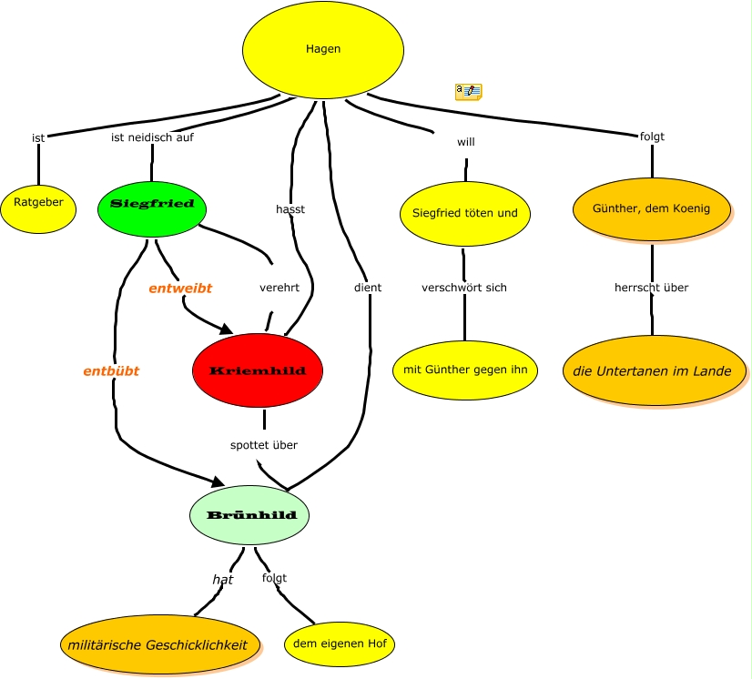 This Concept Map, created with IHMC CmapTools, has information related to: Hagen, Hagen will Siegfried töten und, Kriemhild spottet über Brünhild, Hagen ist neidisch auf Siegfried, Brünhild hat militärische Geschicklichkeit, Kriemhild verehrt Siegfried, Günther, dem Koenig herrscht über die Untertanen im Lande, Hagen hasst Kriemhild, Brünhild folgt dem eigenen Hof, Hagen folgt Günther, dem Koenig, Hagen ist Ratgeber, Siegfried entbübt Brünhild, Siegfried entweibt Kriemhild, Hagen dient Brünhild, Siegfried töten und verschwört sich mit Günther gegen ihn