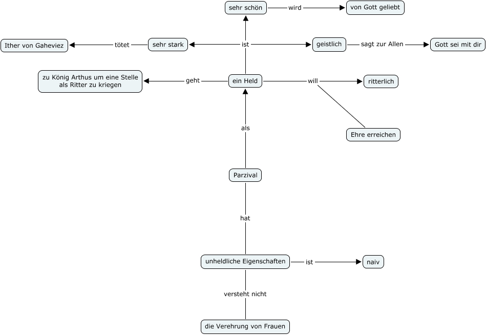 This Concept Map, created with IHMC CmapTools, has information related to: Parzival, ein Held geht zu König Arthus um eine Stelle als Ritter zu kriegen, unheldliche Eigenschaften ist naiv, Parzival hat unheldliche Eigenschaften, unheldliche Eigenschaften versteht nicht die Verehrung von Frauen, ein Held ist sehr stark, geistlich sagt zur Allen Gott sei mit dir, ein Held will Ehre erreichen, Parzival als ein Held, ein Held ist geistlich, sehr stark tötet Ither von Gaheviez, sehr schön wird von Gott geliebt, ein Held will ritterlich, ein Held ist sehr schön