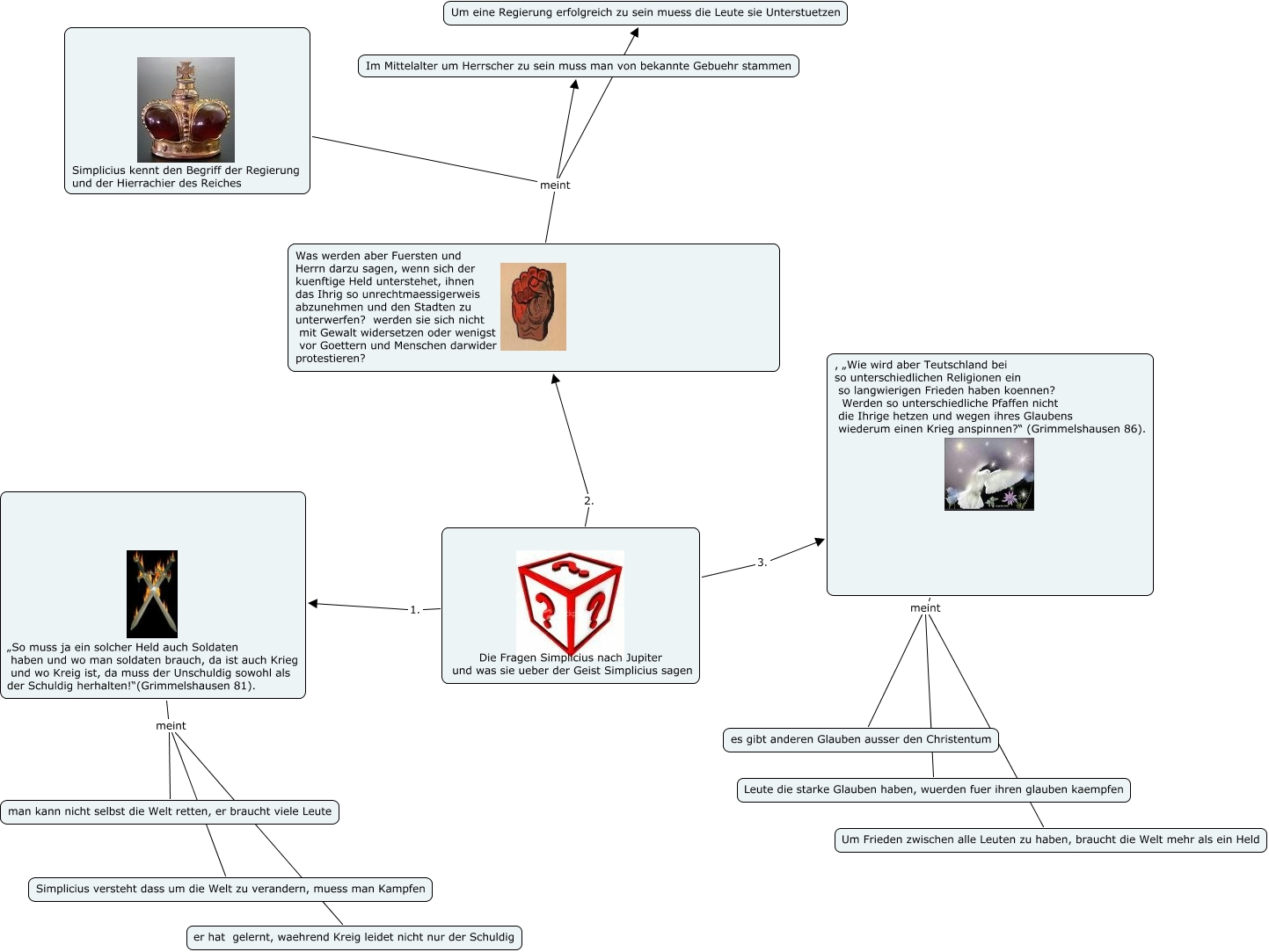 This Concept Map, created with IHMC CmapTools, has information related to: Simplicius, Was werden aber Fuersten und Herrn darzu sagen, wenn sich der kuenftige Held unterstehet, ihnen das Ihrig so unrechtmaessigerweis abzunehmen und den Stadten zu unterwerfen? werden sie sich nicht mit Gewalt widersetzen oder wenigst vor Goettern und Menschen darwider protestieren? meint Im Mittelalter um Herrscher zu sein muss man von bekannte Gebuehr stammen, Die Fragen Simplicius nach Jupiter und was sie ueber der Geist Simplicius sagen 1. „So muss ja ein solcher Held auch Soldaten haben und wo man soldaten brauch, da ist auch Krieg und wo Kreig ist, da muss der Unschuldig sowohl als der Schuldig herhalten!“(Grimmelshausen 81)., Die Fragen Simplicius nach Jupiter und was sie ueber der Geist Simplicius sagen 3. , „Wie wird aber Teutschland bei so unterschiedlichen Religionen ein so langwierigen Frieden haben koennen? Werden so unterschiedliche Pfaffen nicht die Ihrige hetzen und wegen ihres Glaubens wiederum einen Krieg anspinnen?“ (Grimmelshausen 86)., Was werden aber Fuersten und Herrn darzu sagen, wenn sich der kuenftige Held unterstehet, ihnen das Ihrig so unrechtmaessigerweis abzunehmen und den Stadten zu unterwerfen? werden sie sich nicht mit Gewalt widersetzen oder wenigst vor Goettern und Menschen darwider protestieren? meint Um eine Regierung erfolgreich zu sein muess die Leute sie Unterstuetzen, „So muss ja ein solcher Held auch Soldaten haben und wo man soldaten brauch, da ist auch Krieg und wo Kreig ist, da muss der Unschuldig sowohl als der Schuldig herhalten!“(Grimmelshausen 81). meint Simplicius versteht dass um die Welt zu verandern, muess man Kampfen, „So muss ja ein solcher Held auch Soldaten haben und wo man soldaten brauch, da ist auch Krieg und wo Kreig ist, da muss der Unschuldig sowohl als der Schuldig herhalten!“(Grimmelshausen 81). meint man kann nicht selbst die Welt retten, er braucht viele Leute, „So muss ja ein solcher Held auch Soldaten haben und wo man soldaten brauch, da ist auch Krieg und wo Kreig ist, da muss der Unschuldig sowohl als der Schuldig herhalten!“(Grimmelshausen 81). meint er hat gelernt, waehrend Kreig leidet nicht nur der Schuldig, Die Fragen Simplicius nach Jupiter und was sie ueber der Geist Simplicius sagen 2. Was werden aber Fuersten und Herrn darzu sagen, wenn sich der kuenftige Held unterstehet, ihnen das Ihrig so unrechtmaessigerweis abzunehmen und den Stadten zu unterwerfen? werden sie sich nicht mit Gewalt widersetzen oder wenigst vor Goettern und Menschen darwider protestieren?, Simplicius kennt den Begriff der Regierung und der Hierrachier des Reiches meint Im Mittelalter um Herrscher zu sein muss man von bekannte Gebuehr stammen, , „Wie wird aber Teutschland bei so unterschiedlichen Religionen ein so langwierigen Frieden haben koennen? Werden so unterschiedliche Pfaffen nicht die Ihrige hetzen und wegen ihres Glaubens wiederum einen Krieg anspinnen?“ (Grimmelshausen 86). meint es gibt anderen Glauben ausser den Christentum, Simplicius kennt den Begriff der Regierung und der Hierrachier des Reiches meint Um eine Regierung erfolgreich zu sein muess die Leute sie Unterstuetzen, , „Wie wird aber Teutschland bei so unterschiedlichen Religionen ein so langwierigen Frieden haben koennen? Werden so unterschiedliche Pfaffen nicht die Ihrige hetzen und wegen ihres Glaubens wiederum einen Krieg anspinnen?“ (Grimmelshausen 86). meint Leute die starke Glauben haben, wuerden fuer ihren glauben kaempfen, , „Wie wird aber Teutschland bei so unterschiedlichen Religionen ein so langwierigen Frieden haben koennen? Werden so unterschiedliche Pfaffen nicht die Ihrige hetzen und wegen ihres Glaubens wiederum einen Krieg anspinnen?“ (Grimmelshausen 86). meint Um Frieden zwischen alle Leuten zu haben, braucht die Welt mehr als ein Held