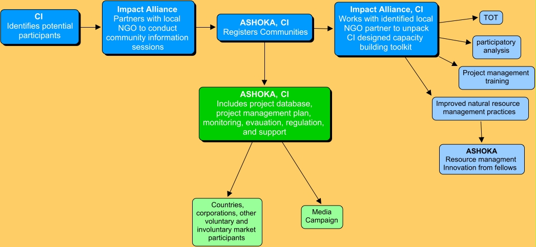 This Concept Map, created with IHMC CmapTools, has information related to: Give Tree, Impact Alliance, CI Works with identified local NGO partner to unpack CI designed capacity building toolkit Improved natural resource management practices, ASHOKA, CI Registers Communities Impact Alliance, CI Works with identified local NGO partner to unpack CI designed capacity building toolkit, ASHOKA, CI Registers Communities ASHOKA, CI Includes project database, project management plan, monitoring, evauation, regulation, and support, ASHOKA, CI Includes project database, project management plan, monitoring, evauation, regulation, and support Countries, corporations, other voluntary and involuntary market participants, Impact Alliance Partners with local NGO to conduct community information sessions ASHOKA, CI Registers Communities, Impact Alliance, CI Works with identified local NGO partner to unpack CI designed capacity building toolkit Project management training, Impact Alliance, CI Works with identified local NGO partner to unpack CI designed capacity building toolkit participatory analysis, Impact Alliance, CI Works with identified local NGO partner to unpack CI designed capacity building toolkit TOT, Improved natural resource management practices ASHOKA Resource managment Innovation from fellows, CI Identifies potential participants Impact Alliance Partners with local NGO to conduct community information sessions, ASHOKA, CI Includes project database, project management plan, monitoring, evauation, regulation, and support Media Campaign