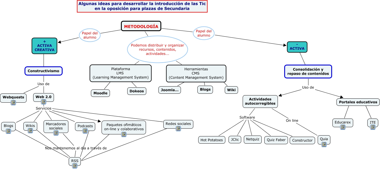 Este Cmap, tiene información relacionada con: Tic y oposiciones, Portales educativos ???? Educarex, Actividades autocorregibles Software Hot Potatoes, Constructivismo Uso de Webquests, METODOLOGÍA Papel del alumno + ACTIVA CREATIVA, METODOLOGÍA Podemos distribuir y organizar recursos, contenidos, actividades... Herramientas CMS (Content Management System), Redes sociales ???? RSS, Actividades autocorregibles Software JClic, Actividades autocorregibles On line Quia, Web 2.0 Servicios Paquetes ofimáticos on-line y colaborativos, Blogs RSS, Consolidación y repaso de contenidos Uso de Actividades autocorregibles, Paquetes ofimáticos on-line y colaborativos ???? RSS, Redes sociales Servicios Paquetes ofimáticos on-line y colaborativos, METODOLOGÍA Papel del alumno - ACTIVA, Web 2.0 Servicios Wikis, Redes sociales Servicios Marcadores sociales, Podcasts ???? RSS, Web 2.0 Servicios Blogs, + ACTIVA CREATIVA ???? Constructivismo, Web 2.0 Servicios Marcadores sociales