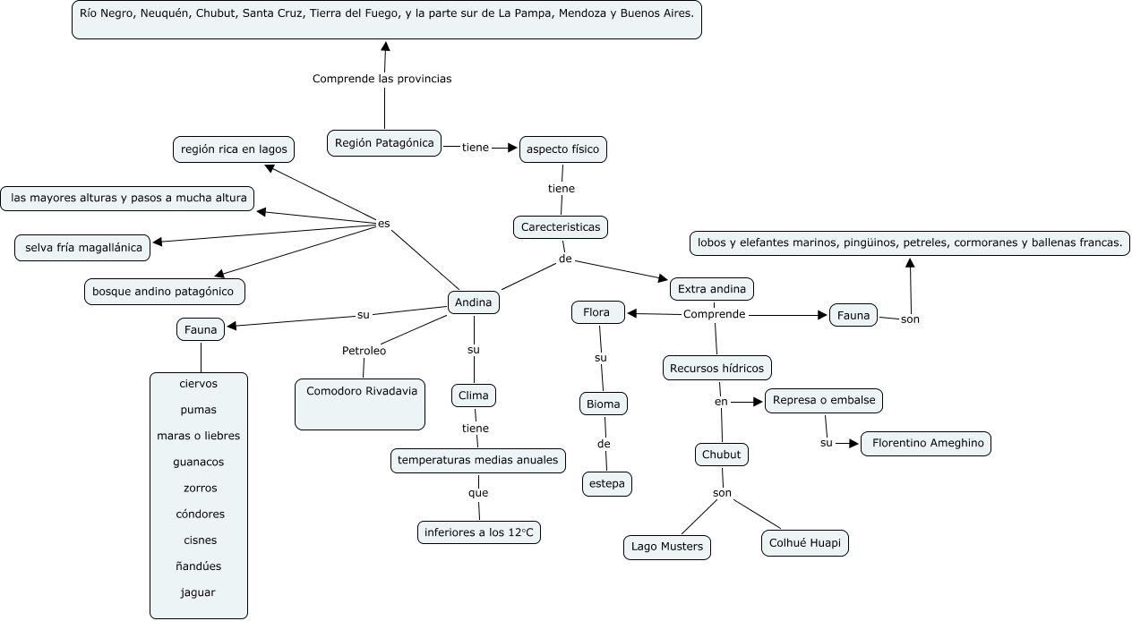 Este mapa conceptual tiene información relacionada a: D'Addezio 4°2°, Región Patagónica tiene aspecto físico, Extra andina Comprende Recursos hídricos, Andina su Fauna, Flora su Bioma, Andina es bosque andino patagónico, Andina es región rica en lagos, Extra andina Comprende Fauna, Represa o embalse su Florentino Ameghino, Andina es las mayores alturas y pasos a mucha altura, Clima tiene temperaturas medias anuales