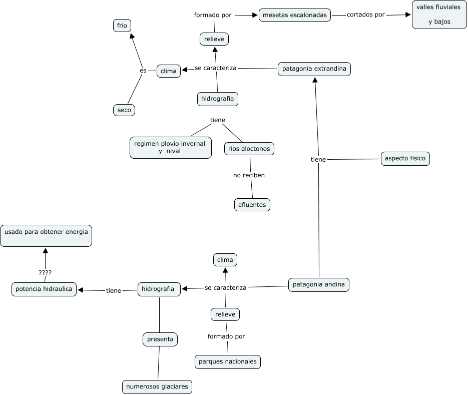 Este mapa conceptual tiene información relacionada a: carito =) 4to 2da, hidrografia tiene rios aloctonos, potencia hidraulica ???? usado para obtener energia, relieve formado por mesetas escalonadas, patagonia andina se caracteriza hidrografia, hidrografia tiene regimen plovio invernal y nival, patagonia andina se caracteriza relieve, relieve formado por parques nacionales, aspecto fisico tiene patagonia andina, patagonia extrandina se caracteriza relieve, aspecto fisico tiene patagonia extrandina