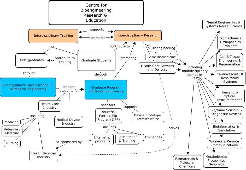 This Concept Map, created with IHMC CmapTools, has information related to: CBRE Education, Health Care Services and Delivery including multidisciplinary themes in Cell & Tissue Engineering & Regeneration, Health Care Services and Delivery including multidisciplinary themes in Cardiovascular & Respiratory Systems, Bioengineering including multidisciplinary themes in Cell & Tissue Engineering & Regeneration, Graduate Program Biomedical Engineering through Graduate Students, Undergraduate Specialization in Biomedical Engineering prepares students for Graduate Program Biomedical Engineering, Basic Biomedicine including multidisciplinary themes in Cardiovascular & Respiratory Systems, Bioengineering including multidisciplinary themes in Metabolomics Proteomics Genomics, Health Care Services and Delivery including multidisciplinary themes in Imaging & Optical Instrumentation, Basic Biomedicine including multidisciplinary themes in Imaging & Optical Instrumentation, Health Care Services and Delivery serves Health Services Industry, Basic Biomedicine including multidisciplinary themes in Neural Engineering & Systems Neural Science, Graduate Program Biomedical Engineering sponsors Industrial Partnership Program (IPP), Bioengineering including multidisciplinary themes in Imaging & Optical Instrumentation, Interdisciplinary Training of Graduate Students, Graduate Program Biomedical Engineering supports Device prototype Infrastructure, Basic Biomedicine including multidisciplinary themes in Bio/Nano Sensors & Diagnostic Devices, Graduate Students contribute to Interdisciplinary Research, Health Care Industry including Medicine, Health Care Services and Delivery including multidisciplinary themes in Biomaterials & Molecular Chemicals, Exchanges includes Recruitment & Training