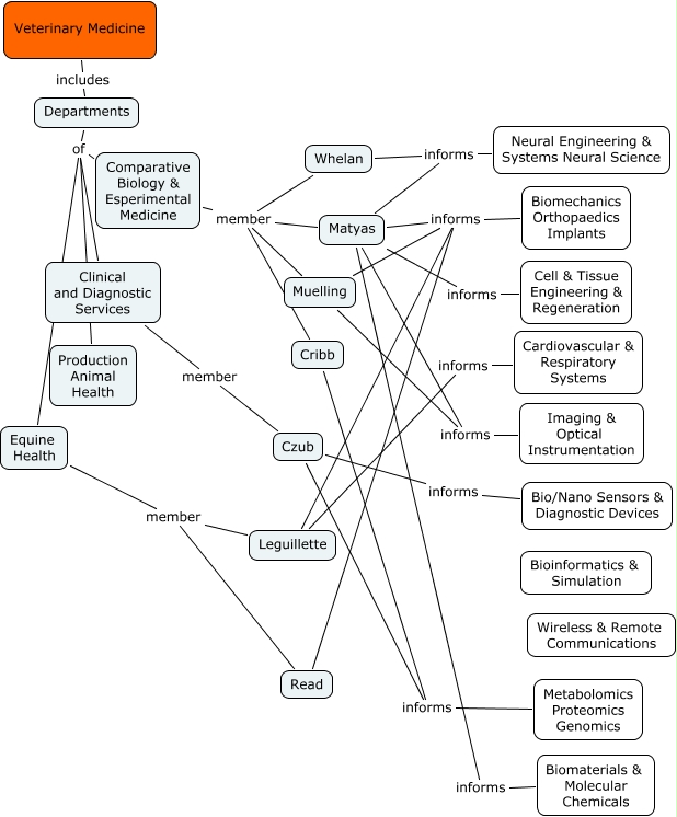 This Concept Map, created with IHMC CmapTools, has information related to: _VetMed2, Equine Health member Read, Leguillette informs Biomechanics Orthopaedics Implants, Matyas informs Neural Engineering & Systems Neural Science, Departments of Production Animal Health, Departments of Clinical and Diagnostic Services, Cribb informs Metabolomics Proteomics Genomics, Matyas informs Biomaterials & Molecular Chemicals, Czub informs Bio/Nano Sensors & Diagnostic Devices, Leguillette informs Cardiovascular & Respiratory Systems, Veterinary Medicine includes Departments, Read informs Biomechanics Orthopaedics Implants, Matyas informs Imaging & Optical Instrumentation, Matyas informs Cell & Tissue Engineering & Regeneration, Departments of Equine Health, Whelan member Comparative Biology & Esperimental Medicine, Matyas informs Biomechanics Orthopaedics Implants, Whelan informs Neural Engineering & Systems Neural Science, Cribb member Muelling, Equine Health member Leguillette, Czub informs Metabolomics Proteomics Genomics