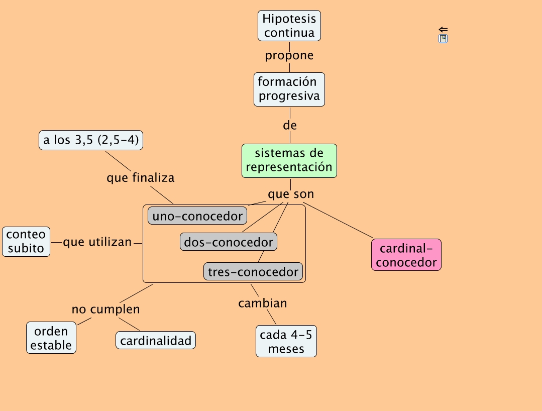 Este mapa conceptual tiene información relacionada a: ezagutza5, no cumplen orden estable, Hipotesis continua propone formación progresiva, formación progresiva de sistemas de representación, que utilizan conteo subito, no cumplen cardinalidad, sistemas de representación que son uno-conocedor, sistemas de representación que son tres-conocedor, cambian cada 4-5 meses, sistemas de representación que son dos-conocedor, sistemas de representación que son cardinal- conocedor, que finaliza a los 3,5 (2,5-4)