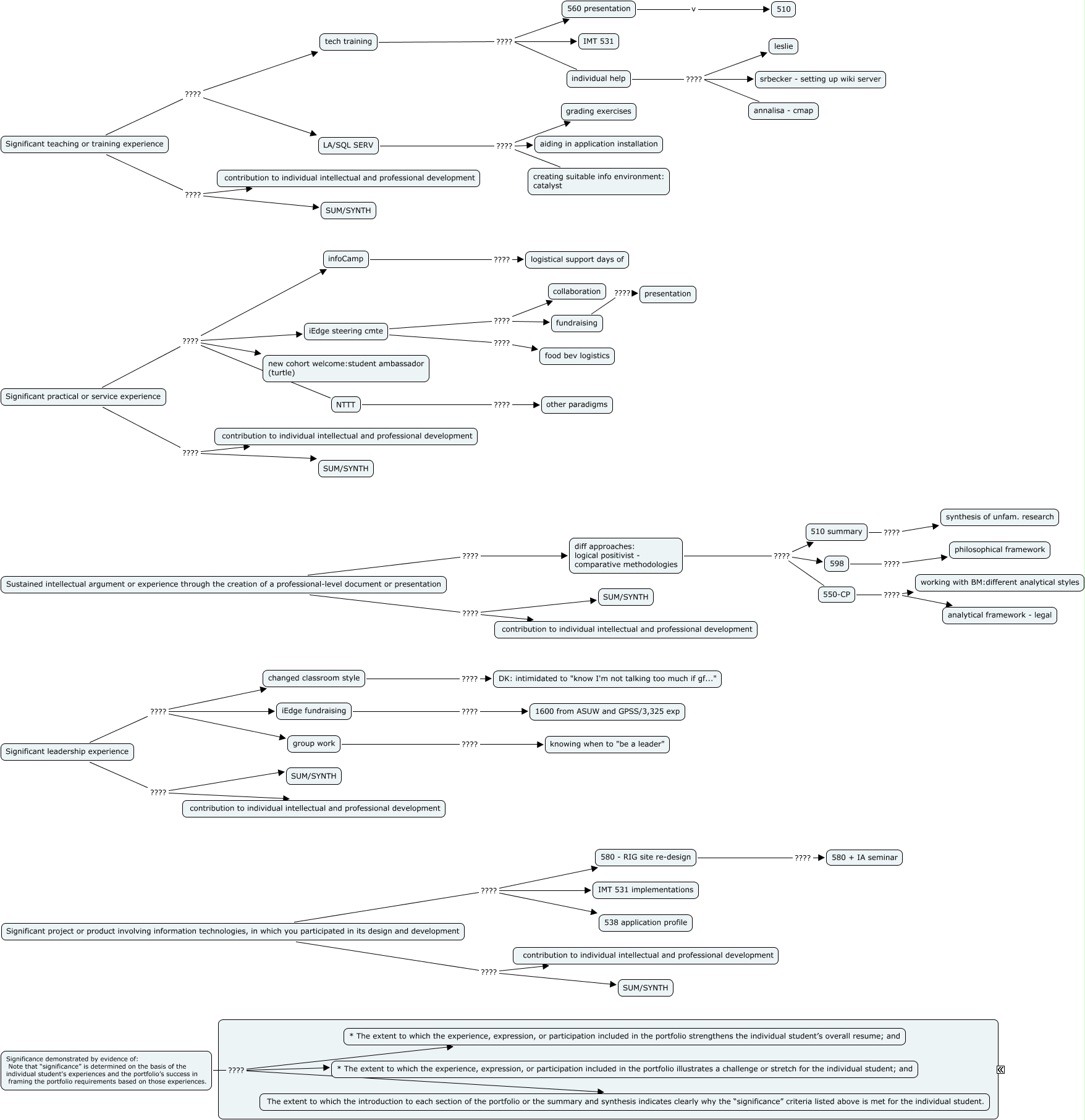 portfolio, LA/SQL SERV ???? grading exercises, Significant leadership experience ???? iEdge fundraising, tech training ???? 560 presentation, Significant practical or service experience ???? NTTT, Significant project or product involving information technologies, in which you participated in its design and development ???? 580 - RIG site re-design, Significant project or product involving information technologies, in which you participated in its design and development ???? 538 application profile, individual help ???? leslie, individual help ???? annalisa - cmap, Significant teaching or training experience ???? contribution to individual intellectual and professional development, Significance demonstrated by evidence of: Note that “significance” is determined on the basis of the individual student's experiences and the portfolio’s success in framing the portfolio requirements based on those experiences. ???? The extent to which the introduction to each section of the portfolio or the summary and synthesis indicates clearly why the “significance” criteria listed above is met for the individual student.