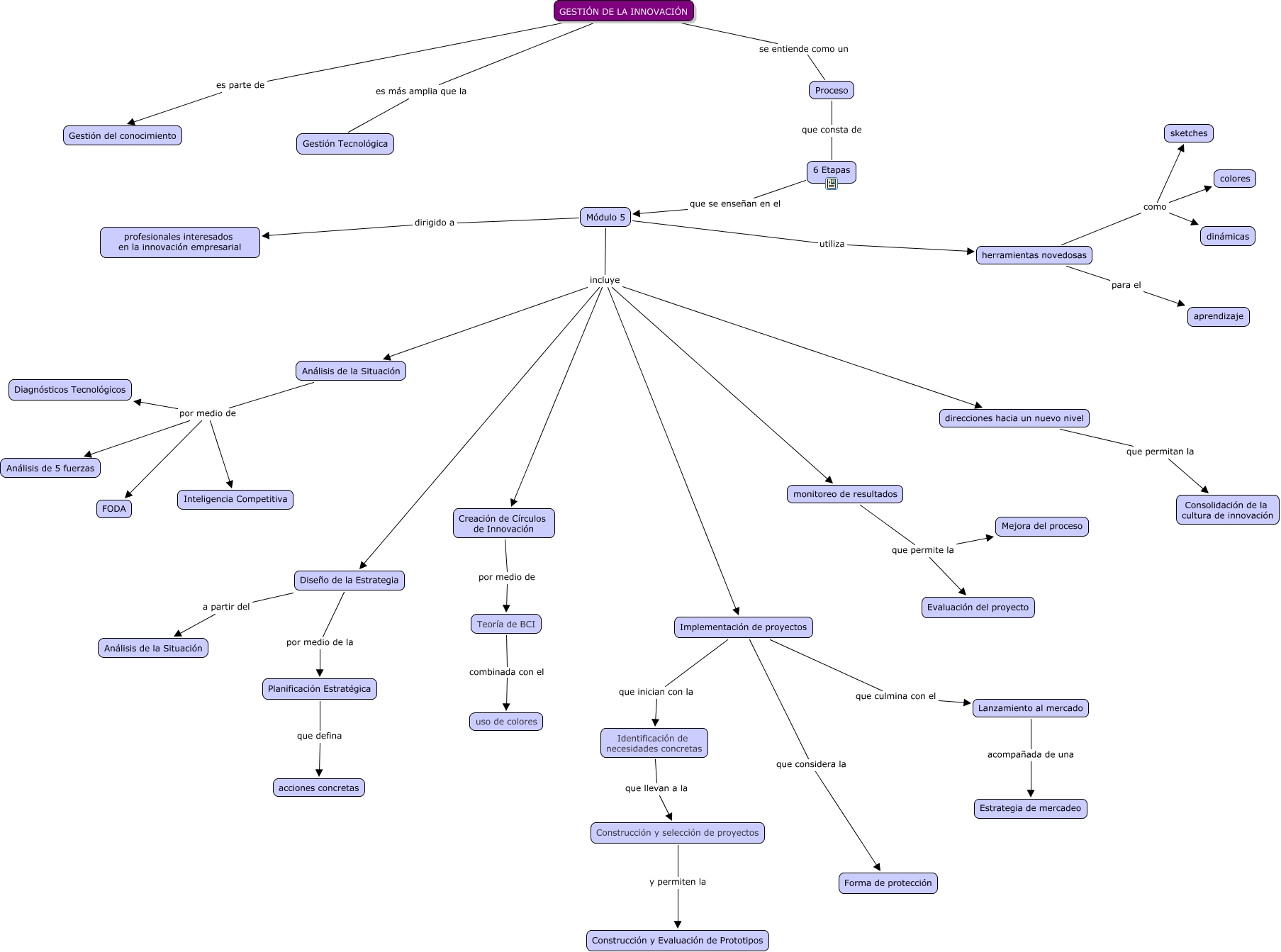 Este Cmap, tiene información relacionada con: Módulo Gestión de la Innovación, GESTIÓN DE LA INNOVACIÓN es más amplia que la Gestión Tecnológica, Construcción y selección de proyectos y permiten la Construcción y Evaluación de Prototipos, Análisis de la Situación por medio de Análisis de 5 fuerzas, GESTIÓN DE LA INNOVACIÓN se entiende como un Proceso, Análisis de la Situación por medio de Inteligencia Competitiva, Creación de Círculos de Innovación por medio de Teoría de BCI, Lanzamiento al mercado acompañada de una Estrategia de mercadeo, Módulo 5 incluye Implementación de proyectos, Módulo 5 utiliza herramientas novedosas, Módulo 5 incluye Diseño de la Estrategia, Identificación de necesidades concretas que llevan a la Construcción y selección de proyectos, Proceso que consta de 6 Etapas, herramientas novedosas para el aprendizaje, Diseño de la Estrategia a partir del Análisis de la Situación, Módulo 5 dirigido a profesionales interesados en la innovación empresarial, herramientas novedosas como colores, Implementación de proyectos que considera la Forma de protección, Diseño de la Estrategia por medio de la Planificación Estratégica, Implementación de proyectos que inician con la Identificación de necesidades concretas, Planificación Estratégica que defina acciones concretas