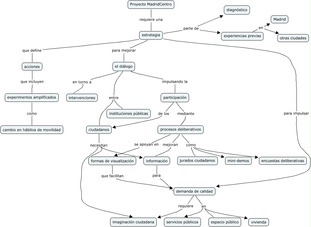 Este Cmap, tiene información relacionada con: Esquema_Proyecto_EstadioBorrador, estrategia parte de experiencias previas, demanda de calidad en espacio público, estrategia para impulsar demanda de calidad, Proyecto MadridCentro requiere una estrategia, demanda de calidad en vivienda, ciudadanos necesitan imaginación ciudadana, acciones que incluyen experimentos amplificados, procesos deliberativos como jurados ciudadanos, demanda de calidad en servicios públicos, el diálogo impulsando la participación, procesos deliberativos como mini-demos, procesos deliberativos como encuestas deliberativas, el diálogo entre ciudadanos, participación mediante procesos deliberativos, estrategia que define acciones, información para demanda de calidad, estrategia para mejorar el diálogo, participación de los ciudadanos, procesos deliberativos mejoran información, ciudadanos necesitan información