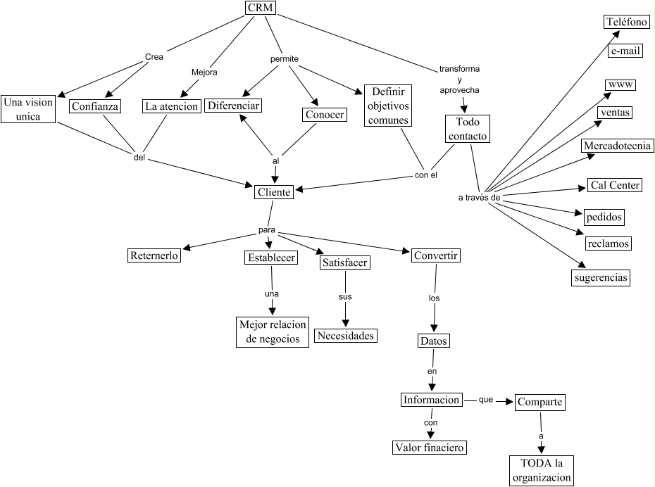 Este Cmap, tiene información relacionada con: CRMMIY, Definir objetivos comunes con el Cliente, Informacion con Valor finaciero, Comparte a TODA la organizacion, Informacion que Comparte, CRM Crea Una vision unica, Cliente para Reternerlo, Todo contacto a través de pedidos, Conocer al Cliente, Todo contacto con el Cliente, CRM permite Definir objetivos comunes, Confianza del Cliente, CRM Crea Confianza, Todo contacto a través de reclamos, Conocer al Diferenciar, Todo contacto a través de ventas, Todo contacto a través de Teléfono, Datos en Informacion, Convertir los Datos, Establecer una Mejor relacion de negocios, La atencion del Cliente