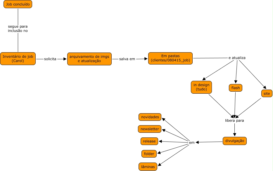 Este Mapa Conceitual tem informações relacionadas a: Mapa de Atualização de Portfolio, divulgação em novidades, divulgação em newsletter, in design (tudo) libera para divulgação, divulgação em release, Em pastas (clientes/080415_job) e atualiza flash, Em pastas (clientes/080415_job) e atualiza in design (tudo), Inventário de job (Carol) solicita arquivamento de imgs e atualização, divulgação em folder, divulgação em lâminas, Em pastas (clientes/080415_job) e atualiza site, arquivamento de imgs e atualização salva em Em pastas (clientes/080415_job), flash libera para divulgação, Job concluído segue para inclusão no Inventário de job (Carol), site libera para divulgação