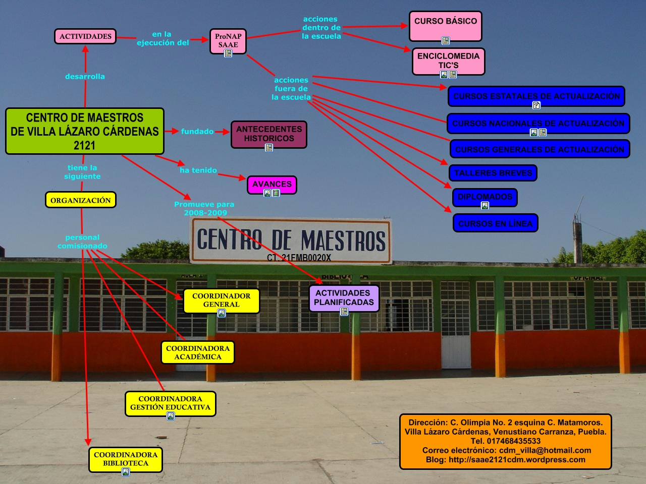 Este Cmap, tiene información relacionada con: ORGANIGRAMA CDM2121, CENTRO DE MAESTROS DE VILLA LÁZARO CÁRDENAS 2121 ha tenido AVANCES, ACTIVIDADES en la ejecución del ProNAP SAAE, ORGANIZACIÓN personal comisionado COORDINADORA BIBLIOTECA, ORGANIZACIÓN personal comisionado COORDINADOR GENERAL, ProNAP SAAE acciones dentro de la escuela CURSO BÁSICO, ProNAP SAAE acciones fuera de la escuela CURSOS EN LÍNEA, ProNAP SAAE acciones fuera de la escuela DIPLOMADOS, CENTRO DE MAESTROS DE VILLA LÁZARO CÁRDENAS 2121 desarrolla ACTIVIDADES, ProNAP SAAE acciones fuera de la escuela CURSOS NACIONALES DE ACTUALIZACIÓN, ProNAP SAAE acciones fuera de la escuela CURSOS GENERALES DE ACTUALIZACIÓN, ProNAP SAAE acciones fuera de la escuela CURSOS ESTATALES DE ACTUALIZACIÓN, CENTRO DE MAESTROS DE VILLA LÁZARO CÁRDENAS 2121 tiene la siguiente ORGANIZACIÓN, ORGANIZACIÓN personal comisionado COORDINADORA GESTIÓN EDUCATIVA, CENTRO DE MAESTROS DE VILLA LÁZARO CÁRDENAS 2121 fundado ANTECEDENTES HISTORICOS, ORGANIZACIÓN personal comisionado COORDINADORA ACADÉMICA, ProNAP SAAE acciones fuera de la escuela TALLERES BREVES, CENTRO DE MAESTROS DE VILLA LÁZARO CÁRDENAS 2121 Promueve para 2008-2009 ACTIVIDADES PLANIFICADAS, ProNAP SAAE acciones dentro de la escuela ENCICLOMEDIA TIC'S