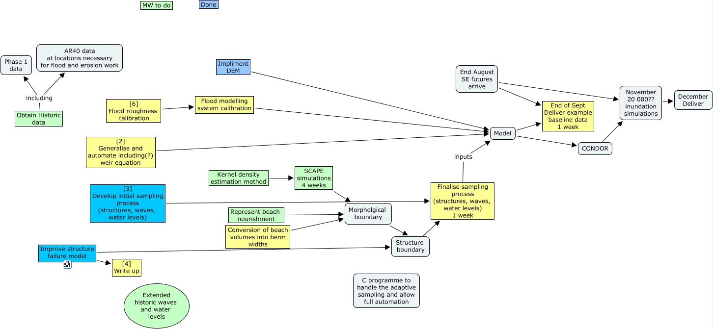 Flood Programme, [3] Develop initial sampling process (structures, waves, water levels) Finalise sampling process (structures, waves, water levels) 1 week, Obtain Historic data including AR40 data at locations necessary for flood and erosion work, Kernel density estimation method SCAPE simulations 4 weeks, SCAPE simulations 4 weeks Morpholgical boundary, November 20 000?? inundation simulations December Deliver, Conversion of beach volumes into berm widths Morpholgical boundary, Improve structure failure model Structure boundary, [2] Generalise and automate including(?) weir equation Model, End August SE futures arrive End of Sept Deliver example baseline data 1 week, Improve structure failure model [4] Write up