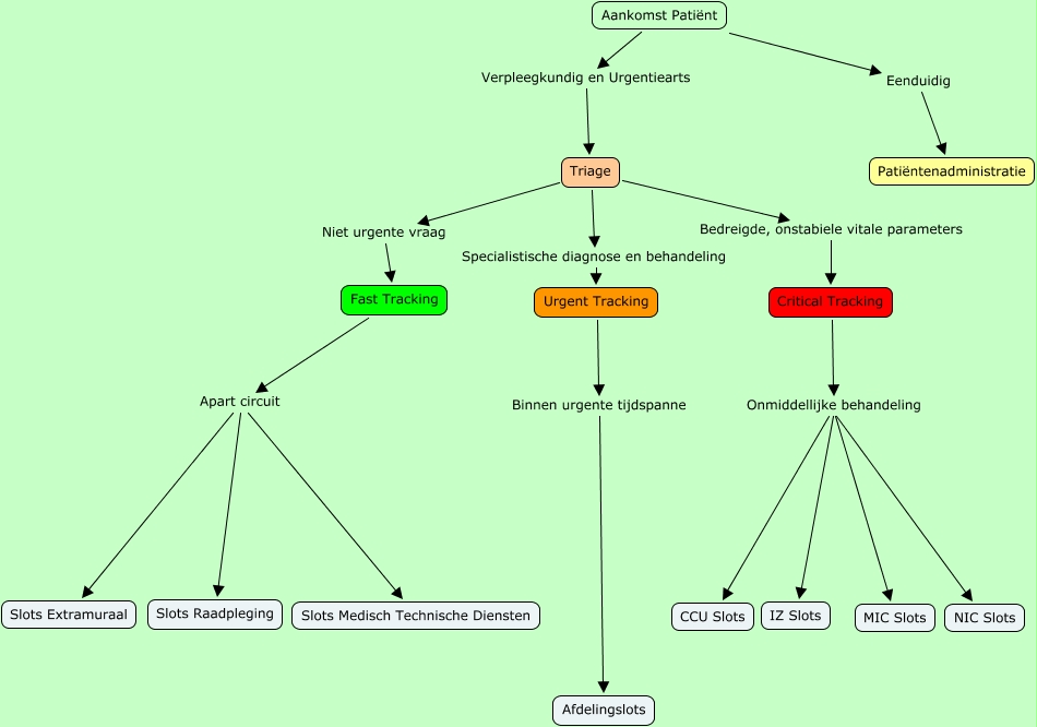 Deze Concept Map heeft informatie gerelateerd aan: Spoedflowbasis, Urgent Tracking Binnen urgente tijdspanne Afdelingslots, Critical Tracking Onmiddellijke behandeling IZ Slots, Critical Tracking Onmiddellijke behandeling MIC Slots, Aankomst Patiënt Verpleegkundig en Urgentiearts Triage, Triage Bedreigde, onstabiele vitale parameters Critical Tracking, Aankomst Patiënt Eenduidig Patiëntenadministratie, Triage Specialistische diagnose en behandeling Urgent Tracking, Fast Tracking Apart circuit Slots Medisch Technische Diensten, Fast Tracking Apart circuit Slots Extramuraal, Critical Tracking Onmiddellijke behandeling CCU Slots