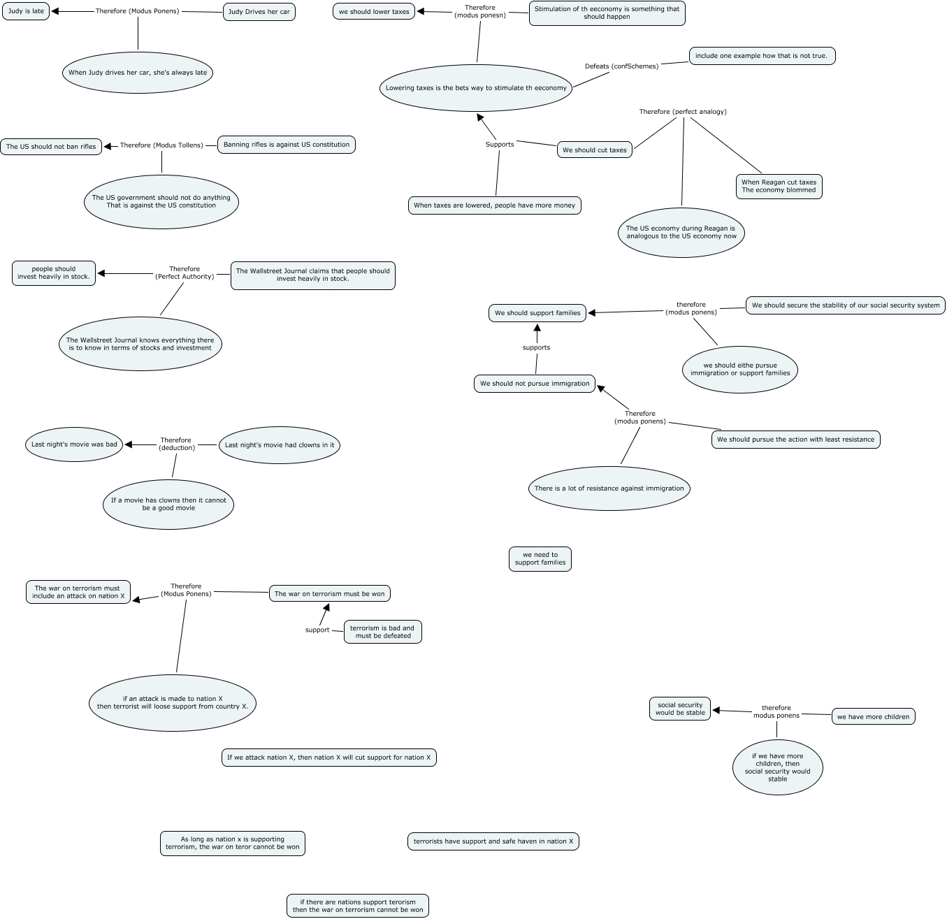 This Concept Map, created with IHMC CmapTools, has information related to: Samuel_Tettner_2.1, Judy Drives her car Therefore (Modus Ponens) Judy is late, The Wallstreet Journal knows everything there is to know in terms of stocks and investment Therefore (Perfect Authority) people should invest heavily in stock., Lowering taxes is the bets way to stimulate th eeconomy Therefore (modus ponesn) we should lower taxes, We should cut taxes Supports Lowering taxes is the bets way to stimulate th eeconomy, The war on terrorism must be won Therefore (Modus Ponens) The war on terrorism must include an attack on nation X, Stimulation of th eeconomy is something that should happen Therefore (modus ponesn) we should lower taxes, There is a lot of resistance against immigration Therefore (modus ponens) We should not pursue immigration, If a movie has clowns then it cannot be a good movie Therefore (deduction) Last night's movie was bad, terrorism is bad and must be defeated support The war on terrorism must be won, we have more children therefore modus ponens social security would be stable, When taxes are lowered, people have more money Supports Lowering taxes is the bets way to stimulate th eeconomy, if an attack is made to nation X then terrorist will loose support from country X. Therefore (Modus Ponens) The war on terrorism must include an attack on nation X, if we have more children, then social security would stable therefore modus ponens social security would be stable, we should eithe pursue immigration or support families therefore (modus ponens) We should support families, We should pursue the action with least resistance Therefore (modus ponens) We should not pursue immigration, When Reagan cut taxes The economy blommed Therefore (perfect analogy) We should cut taxes, We should secure the stability of our social security system therefore (modus ponens) We should support families, The US government should not do anything That is against the US constitution Therefore (Modus Tollens) The US should not ban rifles, include one example how that is not true. Defeats (confSchemes) Lowering taxes is the bets way to stimulate th eeconomy, We should not pursue immigration supports We should support families