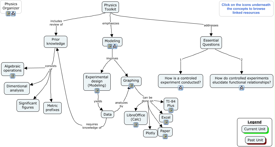This Concept Map, created with IHMC CmapTools, has information related to: ToolKit Organizer, Data analyzes by Graphing, Graphing can be done on Excel, Physics Toolkit emphasizes Modeling, Graphing can be done on Paper, Prior knowledge consists of Metric prefixes, Essential Questions 2 How do controlled experiments elucidate functional relationships?, Prior knowledge consists of Algebraic operations, Modeling involves Graphing, Graphing can be done on Plotly, Physics Toolkit includes review of Prior knowledge, Experimental design (Modeling) yields Data, Prior knowledge consists of Significant figures, Essential Questions 1 How is a controled experiment conducted?, Data requires knowledge of Prior knowledge, Graphing can be done on TI-84 Plus, Prior knowledge consists of Dimentional analysis, Modeling involves Experimental design (Modeling), Graphing can be done on LibreOffice (Calc), Physics Toolkit addresses Essential Questions