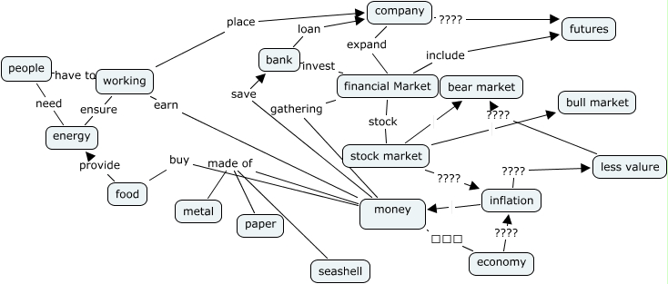 This Concept Map has information related to: money, inflation money, working ensure energy, money 你妮妮 economy, working place company, less valure ???? bear market, financial Market include futures, money buy food, bank invest financial Market, financial Market stock stock market, stock market bull market