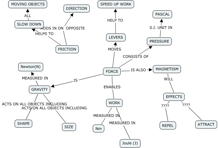 This Concept Map, created with IHMC CmapTools, has information related to: FORCE, PRESSURE, WORK - helping words, FRICTION ADDS IN ON OPPOSITE DIRECTION, EFFECTS ???? REPEL, EFFECTS ???? ATTRACT, FORCE IS ALSO MAGNETISM, LEVERS HELP TO SPEED UP WORK, FORCE IS GRAVITY, PRESSURE S.I. UNIT IN PASCAL, FORCE MOVES LEVERS, MAGNETISM WILL EFFECTS, GRAVITY ACTS ON ALL OBJECTS INCLUDING SHAPE, GRAVITY ACTS ON ALL OBJECTS INCLUDING SIZE, WORK MEASURED IN Joule (J), GRAVITY MEASURED IN Newton(N), FORCE CONSISTS OF PRESSURE, FRICTION HELPS TO SLOW DOWN, FORCE ENABLES WORK, WORK MEASURED IN Nm, SLOW DOWN ALL MOVING OBJECTS