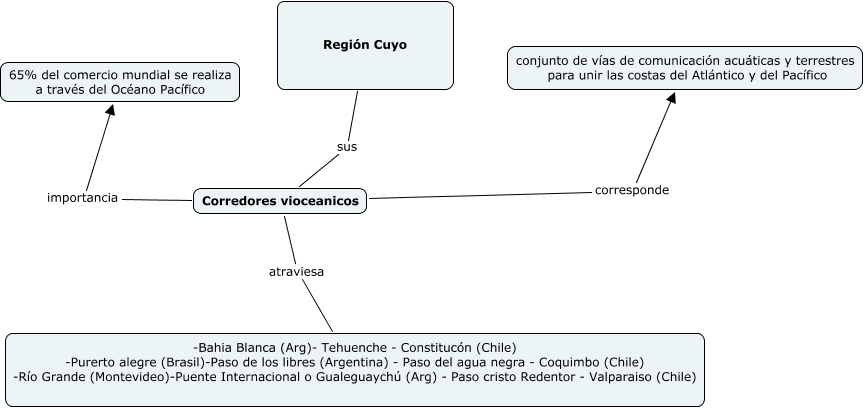Este mapa conceptual tiene información relacionada a: Corredores Bioceanicos D'Addezio 4ª2ª, Región Cuyo sus Corredores vioceanicos, Corredores vioceanicos importancia 65% del comercio mundial se realiza a través del Océano Pacífico, Corredores vioceanicos atraviesa -Bahia Blanca (Arg)- Tehuenche - Constitucón (Chile) -Purerto alegre (Brasil)-Paso de los libres (Argentina) - Paso del agua negra - Coquimbo (Chile) -Río Grande (Montevideo)-Puente Internacional o Gualeguaychú (Arg) - Paso cristo Redentor - Valparaiso (Chile), Corredores vioceanicos corresponde conjunto de vías de comunicación acuáticas y terrestres para unir las costas del Atlántico y del Pacífico