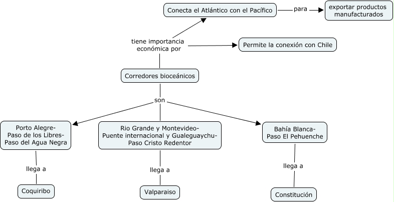 Este mapa conceptual tiene información relacionada a: Franco Benavides 4°3, Rio Grande y Montevideo- Puente internacional y Gualeguaychu- Paso Cristo Redentor llega a Valparaiso, Porto Alegre- Paso de los Libres- Paso del Agua Negra llega a Coquiribo, Bahía Blanca- Paso El Pehuenche llega a Constitución, Corredores bioceánicos son Rio Grande y Montevideo- Puente internacional y Gualeguaychu- Paso Cristo Redentor, Corredores bioceánicos tiene importancia económica por Permite la conexión con Chile, Corredores bioceánicos son Porto Alegre- Paso de los Libres- Paso del Agua Negra, Corredores bioceánicos tiene importancia económica por Conecta el Atlántico con el Pacífico, Conecta el Atlántico con el Pacífico para exportar productos manufacturados, Corredores bioceánicos son Bahía Blanca- Paso El Pehuenche