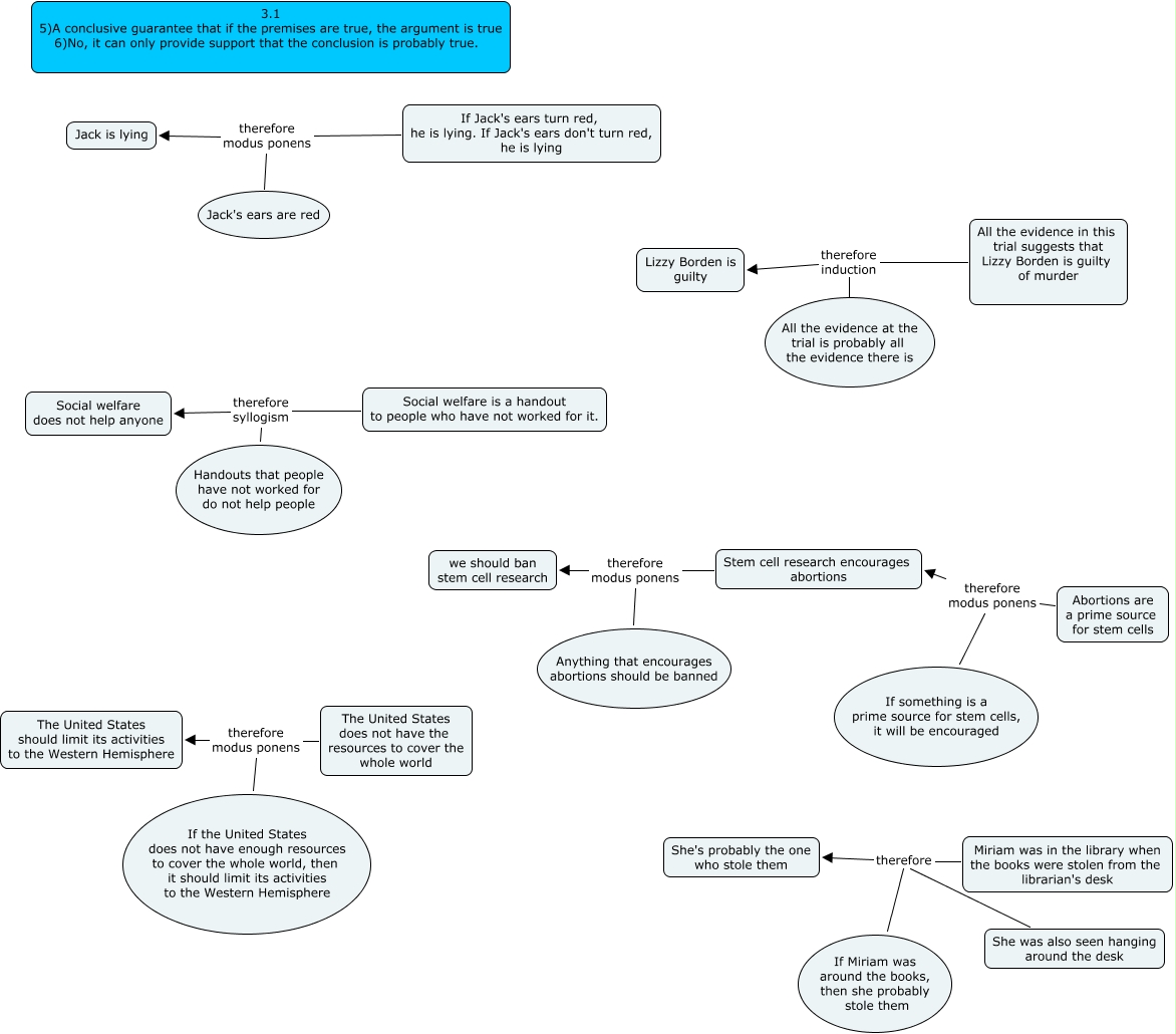 This Concept Map, created with IHMC CmapTools, has information related to: Elise_Homework_3.1, Stem cell research encourages abortions therefore modus ponens we should ban stem cell research, Handouts that people have not worked for do not help people therefore syllogism Social welfare does not help anyone, The United States does not have the resources to cover the whole world therefore modus ponens The United States should limit its activities to the Western Hemisphere, Miriam was in the library when the books were stolen from the librarian's desk therefore She's probably the one who stole them, Abortions are a prime source for stem cells therefore modus ponens Stem cell research encourages abortions, Anything that encourages abortions should be banned therefore modus ponens we should ban stem cell research, If the United States does not have enough resources to cover the whole world, then it should limit its activities to the Western Hemisphere therefore modus ponens The United States should limit its activities to the Western Hemisphere, If Jack's ears turn red, he is lying. If Jack's ears don't turn red, he is lying therefore modus ponens Jack's ears are red, Social welfare is a handout to people who have not worked for it. therefore syllogism Social welfare does not help anyone, All the evidence in this trial suggests that Lizzy Borden is guilty of murder therefore induction All the evidence at the trial is probably all the evidence there is, If something is a prime source for stem cells, it will be encouraged therefore modus ponens Stem cell research encourages abortions, If Jack's ears turn red, he is lying. If Jack's ears don't turn red, he is lying therefore modus ponens Jack is lying, She was also seen hanging around the desk therefore She's probably the one who stole them, If Miriam was around the books, then she probably stole them therefore She's probably the one who stole them, All the evidence in this trial suggests that Lizzy Borden is guilty of murder therefore induction Lizzy Borden is guilty