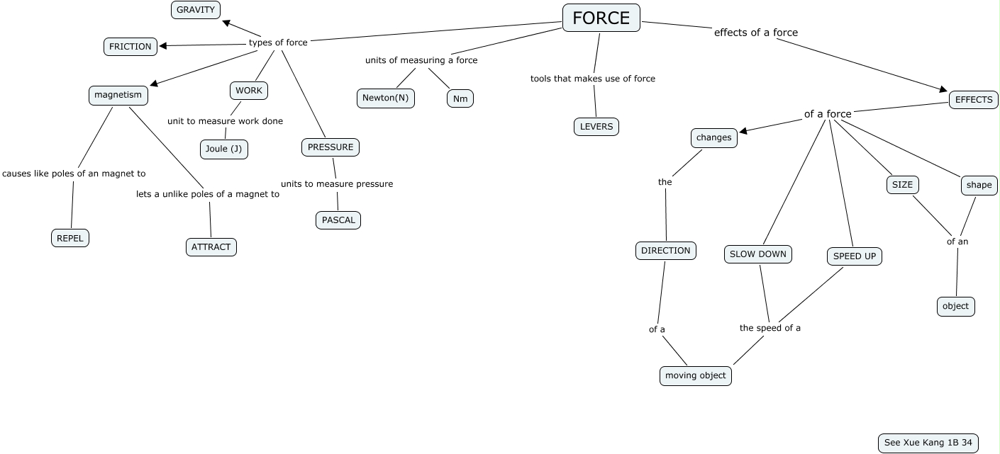This Concept Map, created with IHMC CmapTools, has information related to: 1B_See Xue Kang_(34)FORCE,PRESSURE AND WORK_1, EFFECTS of a force SIZE, FORCE tools that makes use of force LEVERS, FORCE types of force FRICTION, EFFECTS of a force SPEED UP, FORCE units of measuring a force Newton(N), SPEED UP the speed of a moving object, FORCE types of force magnetism, EFFECTS of a force shape, magnetism lets a unlike poles of a magnet to ATTRACT, FORCE types of force WORK, FORCE types of force PRESSURE, EFFECTS of a force SLOW DOWN, shape of an object, FORCE types of force GRAVITY, SIZE of an object, changes the DIRECTION, FORCE effects of a force EFFECTS, SLOW DOWN the speed of a moving object, magnetism causes like poles of an magnet to REPEL, FORCE units of measuring a force Nm