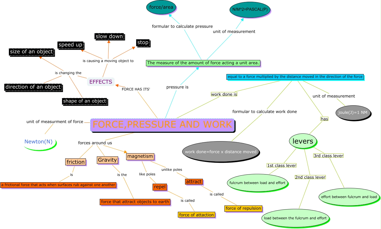 This Concept Map, created with IHMC CmapTools, has information related to: 1B_Sandra Lim (9)_FORCE, PRESSURE AND WORK, EFFECTS is causing a moving object to stop, The measure of the amount of force acting a unit area. unit of measurement N/M^2=PASCAL(P), FORCE,PRESSURE AND WORK pressure is The measure of the amount of force acting a unit area., FORCE,PRESSURE AND WORK FORCE HAS ITS' EFFECTS, levers 1st class lever fulcrum between load and effort, magnetism unlike poles attract, equal to a force multiplied by the distance moved in the direction of the force formular to calculate work done work done=force x distance moved, EFFECTS is causing a moving object to speed up, levers 3rd class lever effort between fulcrum and load, EFFECTS is changing the shape of an object, FORCE,PRESSURE AND WORK forces around us magnetism, The measure of the amount of force acting a unit area. formular to calculate pressure force/area, repel is called force of attaction, Gravity is the force that attract objects to earth, equal to a force multiplied by the distance moved in the direction of the force unit of measurement joule(J)=1 NM, EFFECTS is changing the direction of an object, equal to a force multiplied by the distance moved in the direction of the force has levers, magnetism like poles repel, EFFECTS is changing the size of an object, EFFECTS is causing a moving object to slow down