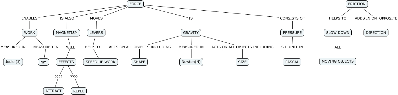 This Concept Map, created with IHMC CmapTools, has information related to: Benny_Lim_1B_(20), FORCE ENABLES WORK, FRICTION HELPS TO SLOW DOWN, FORCE IS GRAVITY, FORCE IS ALSO MAGNETISM, SLOW DOWN ALL MOVING OBJECTS, WORK MEASURED IN Nm, FORCE MOVES LEVERS, WORK MEASURED IN Joule (J), GRAVITY MEASURED IN Newton(N), FORCE CONSISTS OF PRESSURE, GRAVITY ACTS ON ALL OBJECTS INCLUDING SHAPE, EFFECTS ???? ATTRACT, FRICTION ADDS IN ON OPPOSITE DIRECTION, LEVERS HELP TO SPEED UP WORK, EFFECTS ???? REPEL, GRAVITY ACTS ON ALL OBJECTS INCLUDING SIZE, MAGNETISM WILL EFFECTS, PRESSURE S.I. UNIT IN PASCAL