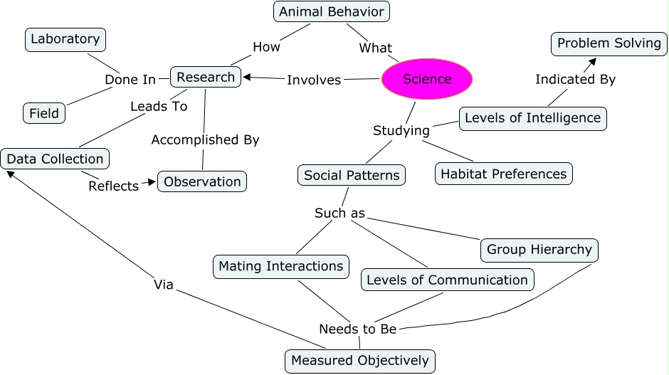 This Concept Map, created with IHMC CmapTools, has information related to: Animal Behavior Tanya and Ellie First, Animal Behavior What Science, Data Collection Reflects Observation, Mating Interactions Needs to Be Levels of Communication, Measured Objectively Via Data Collection, Social Patterns Such as Levels of Communication, Science Studying Levels of Intelligence, Research Leads To Data Collection, Research Done In Laboratory, Social Patterns Such as Mating Interactions, Science Involves Research, Research Accomplished By Observation, Research Done In Field, Science Studying Habitat Preferences, Science Studying Social Patterns, Mating Interactions Needs to Be Measured Objectively, Animal Behavior How Research, Mating Interactions Needs to Be Group Hierarchy, Levels of Intelligence Indicated By Problem Solving, Social Patterns Such as Group Hierarchy