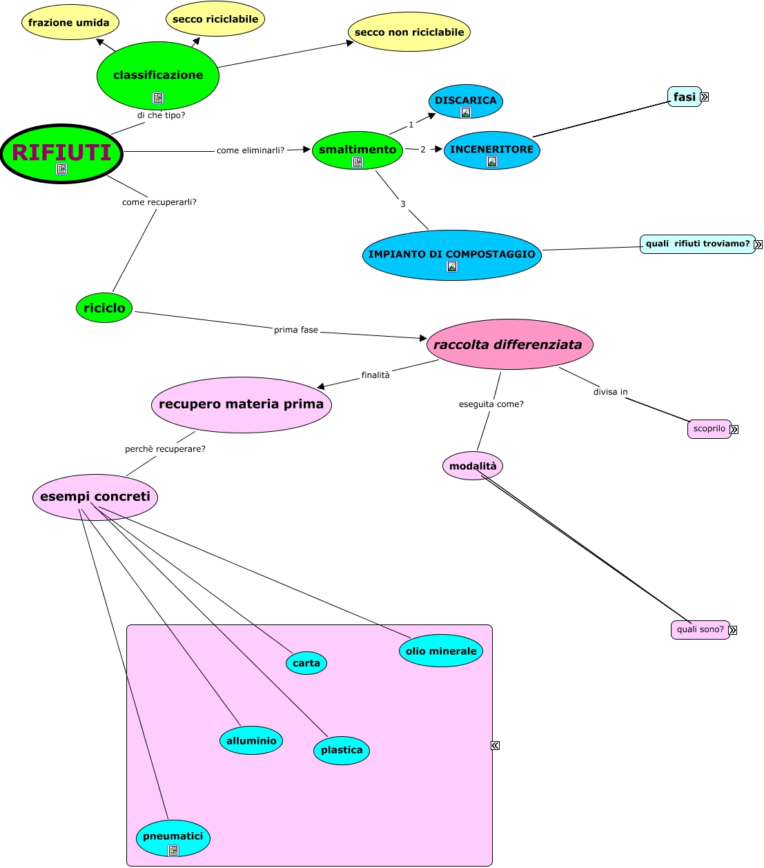 Questa Mappa Concettuale ha informazioni correlate a: ud rifiuti, frazione umida ???? classificazione, recupero materia prima perchè recuperare? esempi concreti, IMPIANTO DI COMPOSTAGGIO quali rifiuti vengono trattati? fondi di caffè, gusci d'uova, modalità ???? contenitori nei negozi, smaltimento 1 DISCARICA, raccolta differenziata finalità recupero materia prima, INCENERITORE 6 fase trattamento dei fumi, smaltimento 3 IMPIANTO DI COMPOSTAGGIO, modalità ???? piattaforme di raccolta e centri ambiente, raccolta differenziata divisa in vetro, lattine e scatolame, raccolta differenziata divisa in plastica, INCENERITORE 1 fase arrivo dei rifiuti, esempi concreti ???? alluminio, classificazione ???? secco riciclabile, INCENERITORE 4 fase produzione di energia elettrica, esempi concreti ???? olio minerale, esempi concreti ???? plastica, riciclo prima fase raccolta differenziata, modalità ???? porta a porta, esempi concreti ???? pneumatici