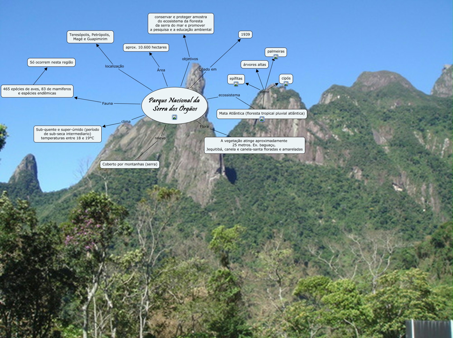 Victoria e laura, Parque Nacional da Serra dos Órgãos Criado em 1939, Parque Nacional da Serra dos Órgãos localização Teresópolis, Petrópolis, Magé e Guapimirim, Parque Nacional da Serra dos Órgãos clima Sub-quente e super-úmido (período de sub-seca intermediario) temperaturas entre 18 e 19°C, Parque Nacional da Serra dos Órgãos relevo Coberto por montanhas (serra), Parque Nacional da Serra dos Órgãos Flora A vegetação atinge aproximadamente 25 metros. Ex. baguaçu, Jequitibá, canela e canela-santa floradas e amareladas, Mata Atlântica (floresta tropical pluvial atlântica) como palmeiras, 465 epécies de aves, 83 de mamiferos e espécies endêmicas ???? Só ocorrem nesta região, Parque Nacional da Serra dos Órgãos objetivos conservar e proteger amostra do ecosistema da floresta da serra do mar e promover a pesquisa e a educação ambiental, Mata Atlântica (floresta tropical pluvial atlântica) como árvores altas, Mata Atlântica (floresta tropical pluvial atlântica) como cipós