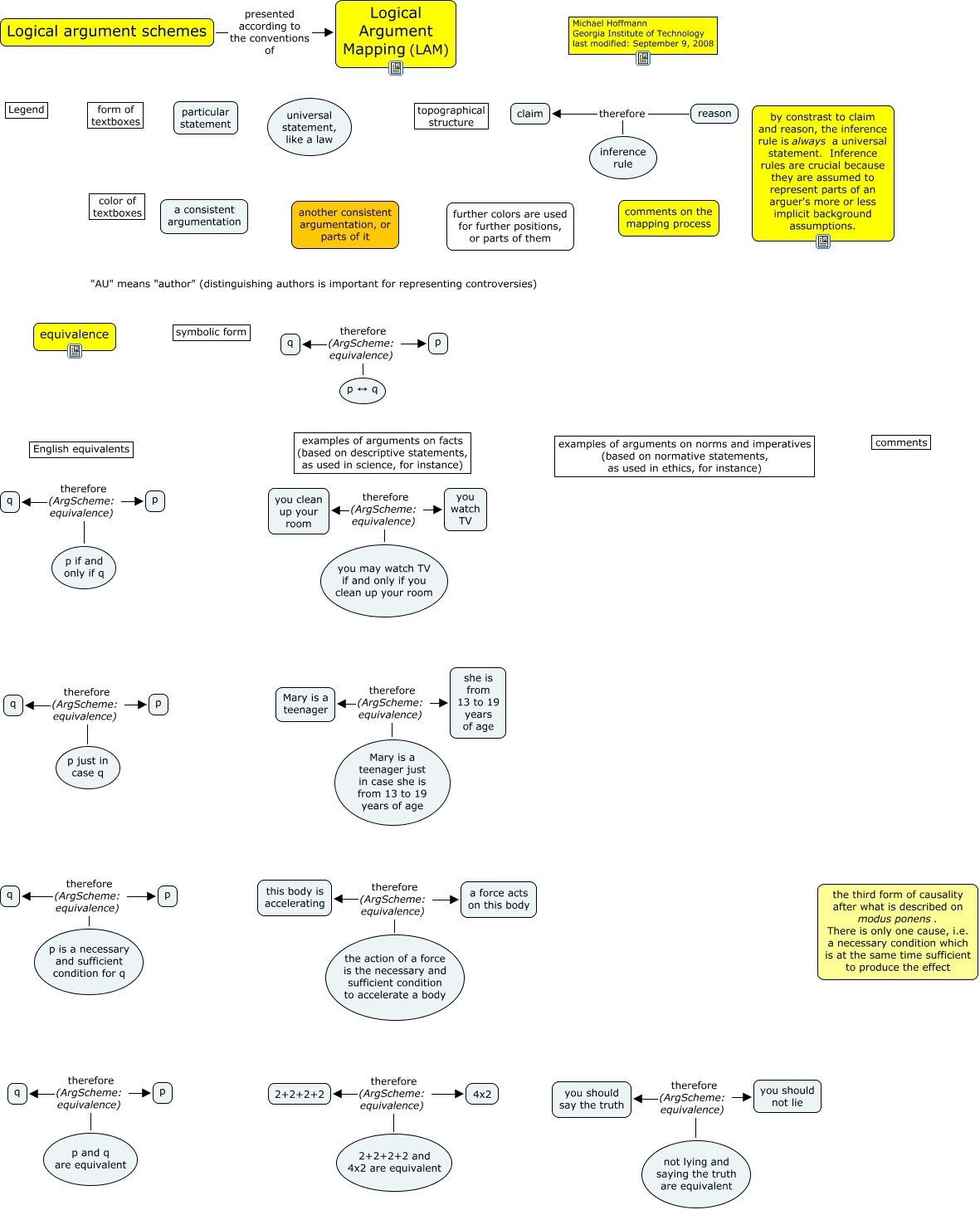 This Concept Map, created with IHMC CmapTools, has information related to: equivalence, p and q are equivalent therefore (ArgScheme: equivalence) q, p just in case q therefore (ArgScheme: equivalence) p, p is a necessary and sufficient condition for q therefore (ArgScheme: equivalence) q, p ↔ q therefore (ArgScheme: equivalence) q, Logical argument schemes presented according to the conventions of Logical Argument Mapping (LAM), 2+2+2+2 and 4x2 are equivalent therefore (ArgScheme: equivalence) 4x2, you may watch TV if and only if you clean up your room therefore (ArgScheme: equivalence) you watch TV, p is a necessary and sufficient condition for q therefore (ArgScheme: equivalence) p, not lying and saying the truth are equivalent therefore (ArgScheme: equivalence) you should not lie, you may watch TV if and only if you clean up your room therefore (ArgScheme: equivalence) you clean up your room, the action of a force is the necessary and sufficient condition to accelerate a body therefore (ArgScheme: equivalence) this body is accelerating, p and q are equivalent therefore (ArgScheme: equivalence) p, p ↔ q therefore (ArgScheme: equivalence) p, reason therefore claim, 2+2+2+2 and 4x2 are equivalent therefore (ArgScheme: equivalence) 2+2+2+2, p if and only if q therefore (ArgScheme: equivalence) p, p just in case q therefore (ArgScheme: equivalence) q, not lying and saying the truth are equivalent therefore (ArgScheme: equivalence) you should say the truth, p if and only if q therefore (ArgScheme: equivalence) q, the action of a force is the necessary and sufficient condition to accelerate a body therefore (ArgScheme: equivalence) a force acts on this body